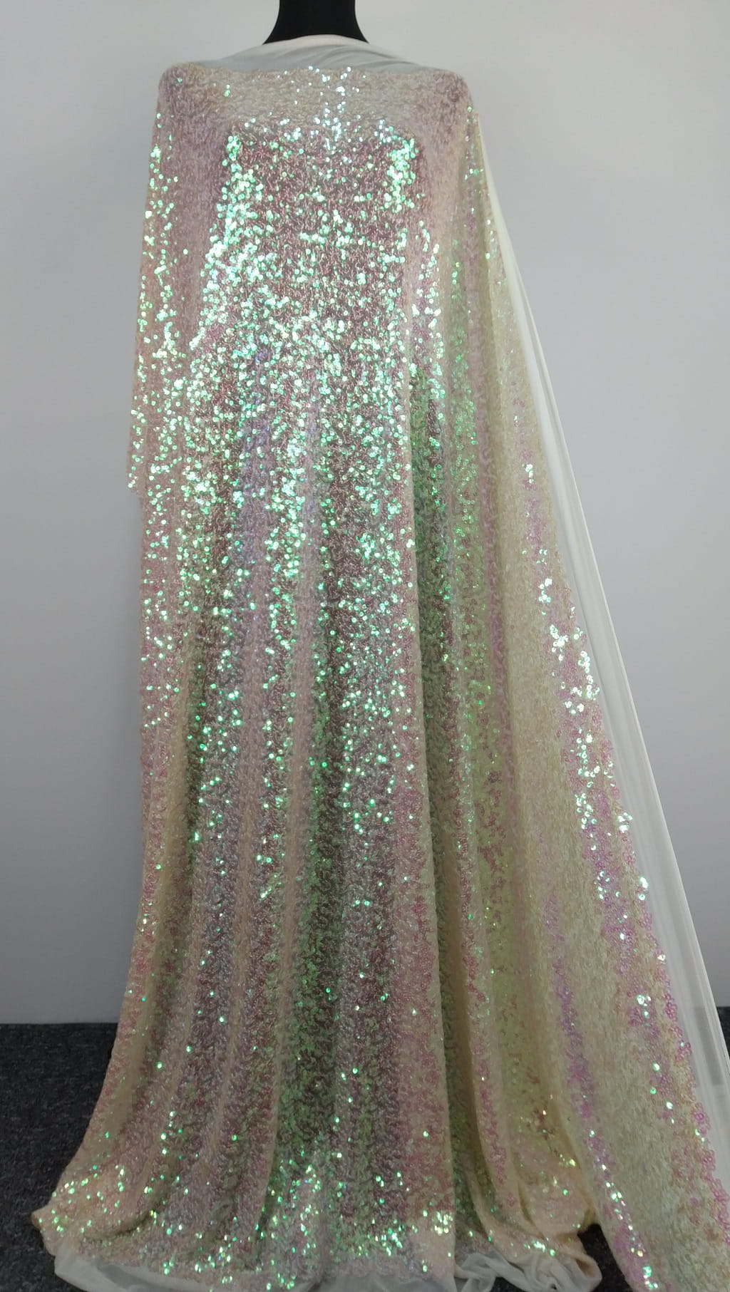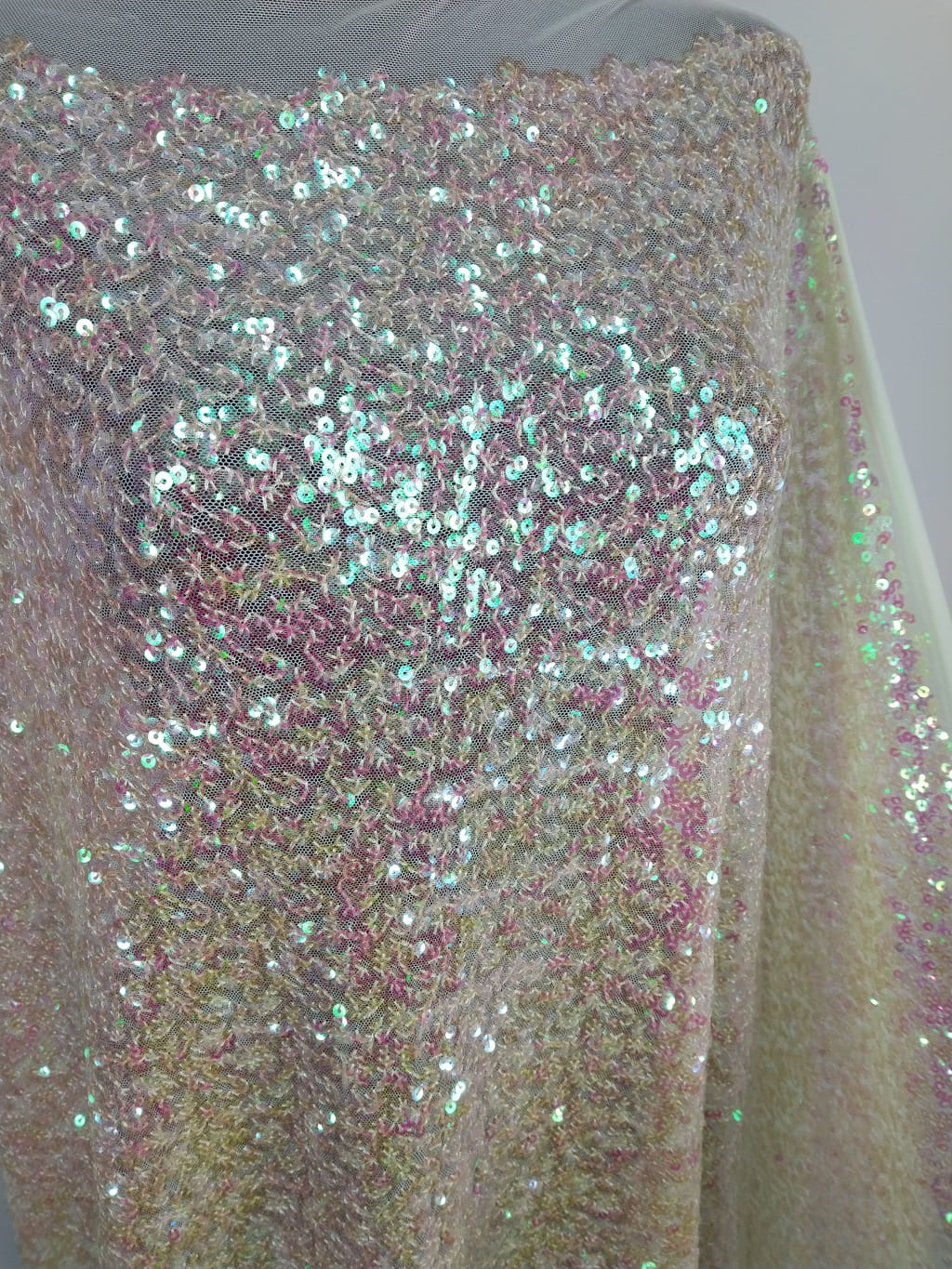 Kremowa elastyczna dzianina (siatka) gęsto wyszyta cekinami. Cekiny mienią się od jasnego kremu po jasnoróżowo-złoty.