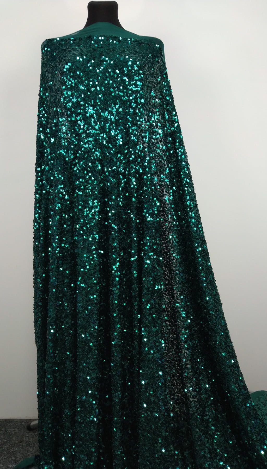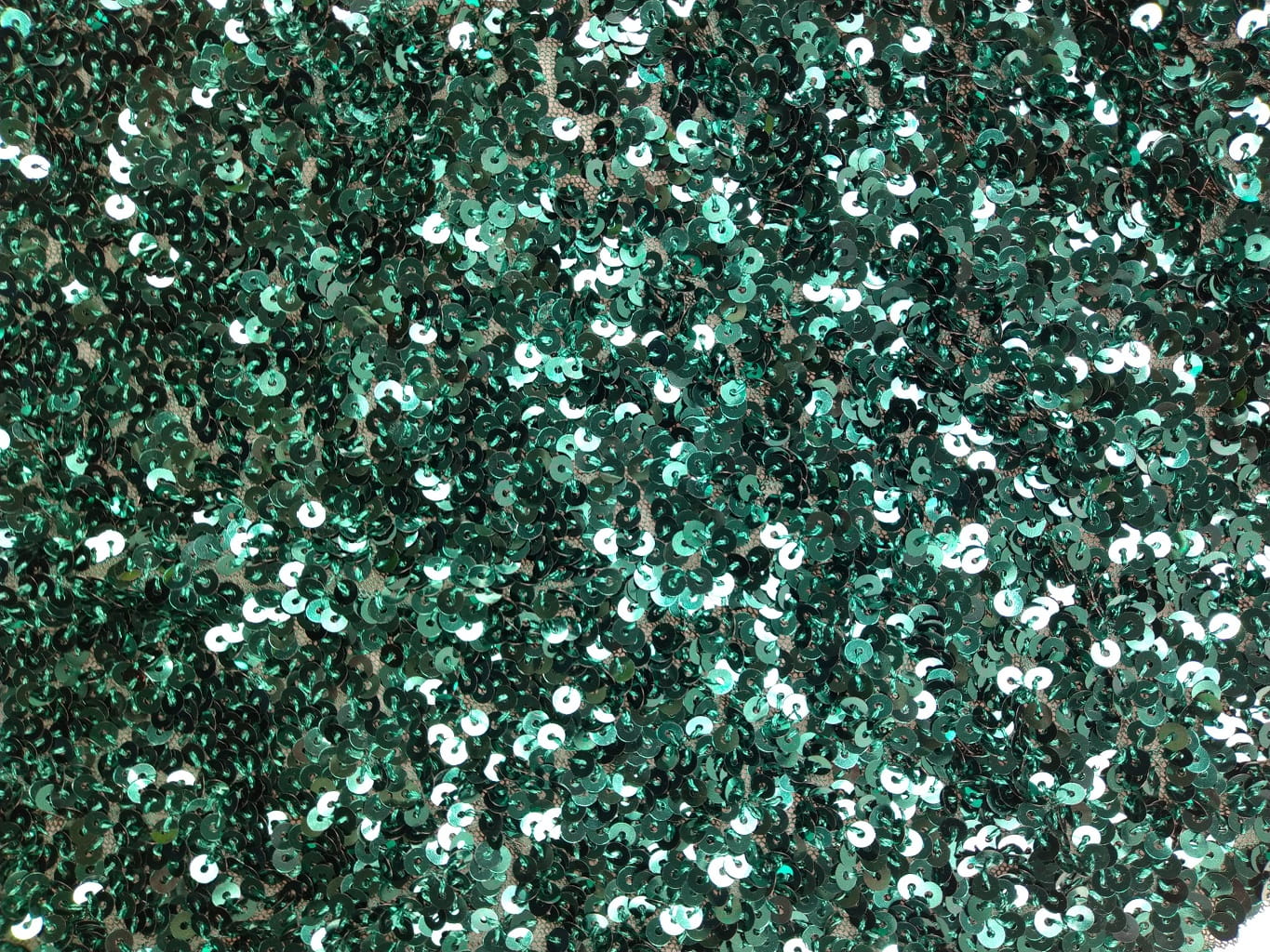 Ciemnozielona elastyczna dzianina (siatka) gęsto wyszyta ciemnozielonymi cekinami.