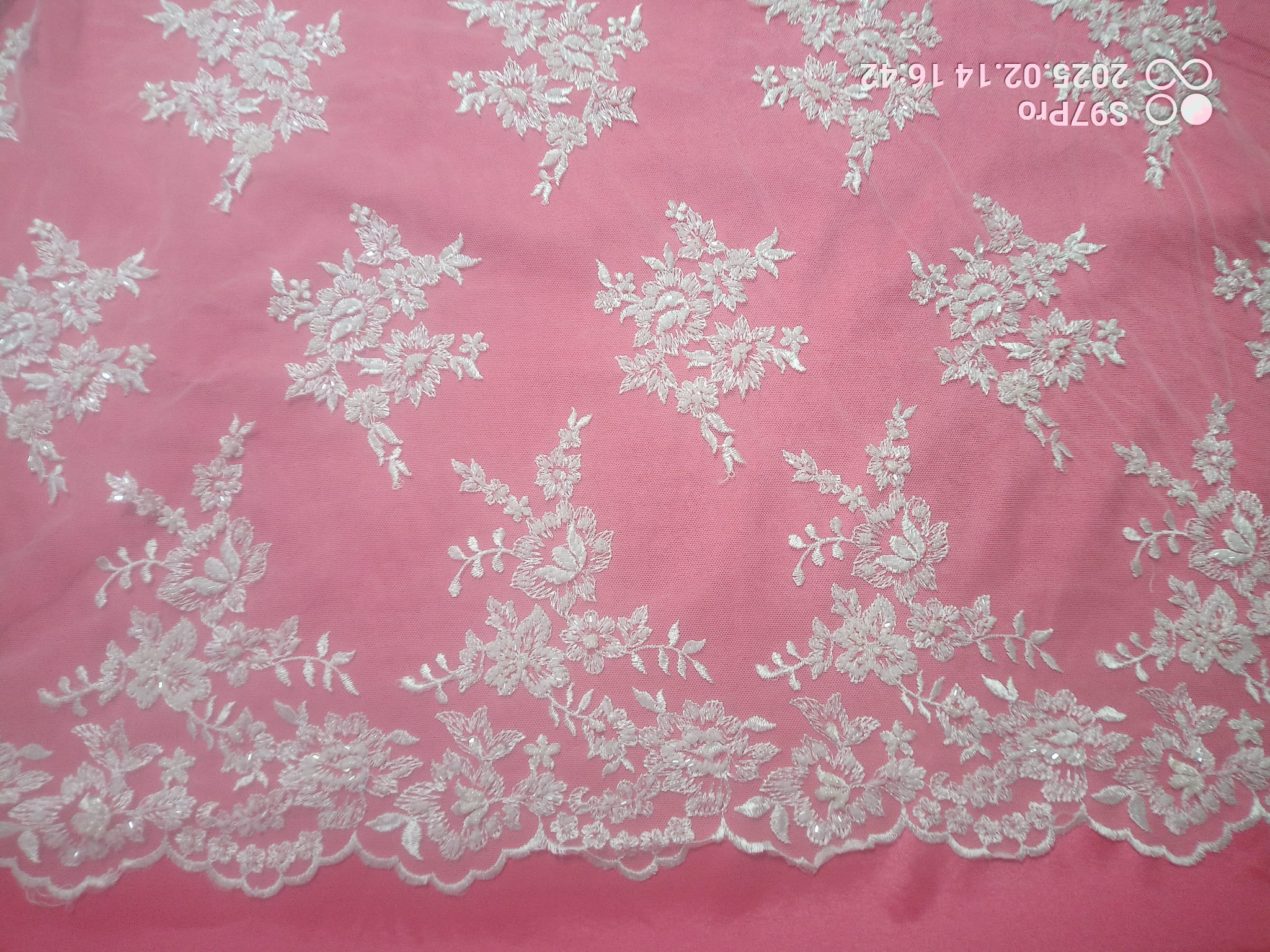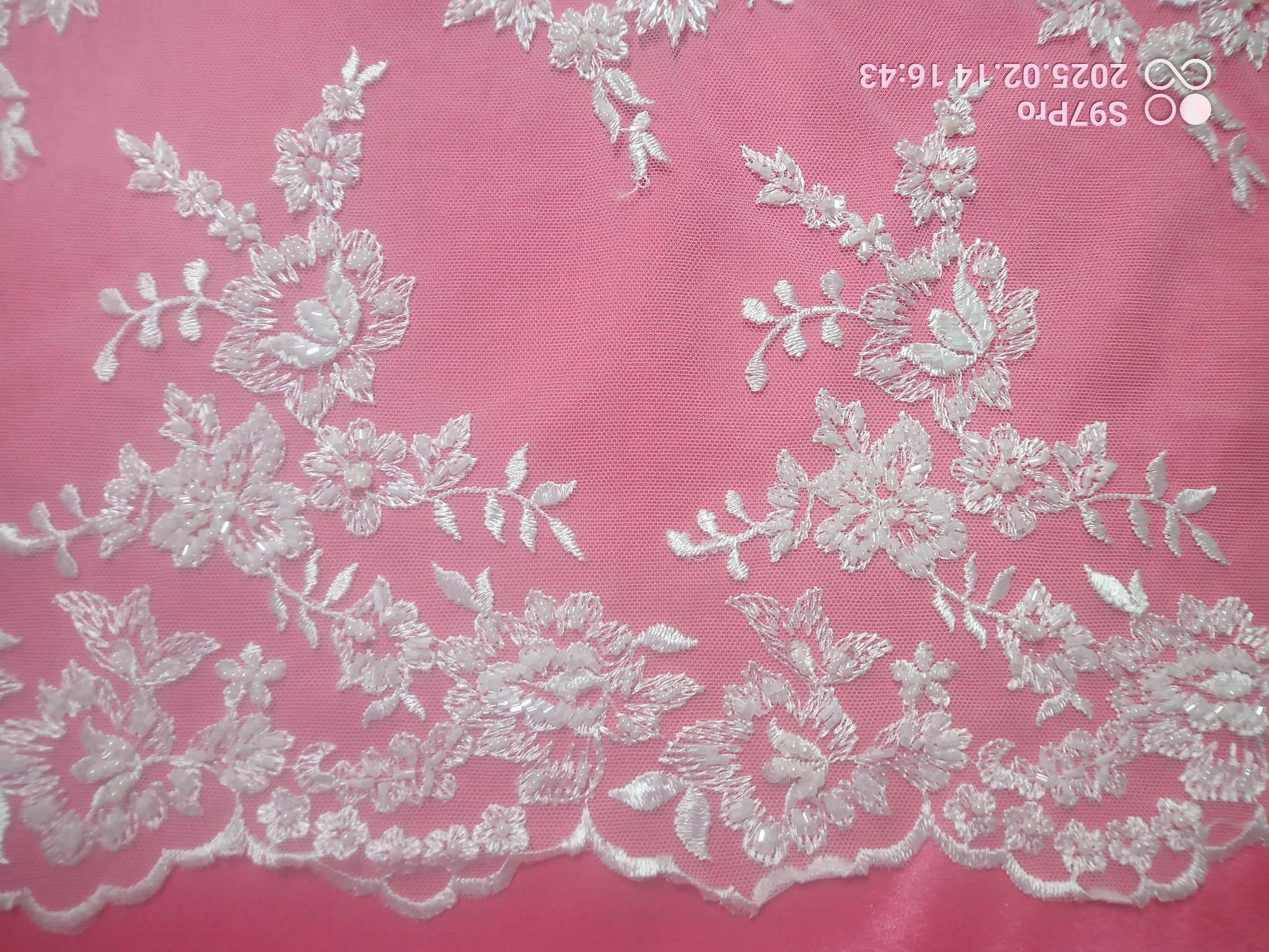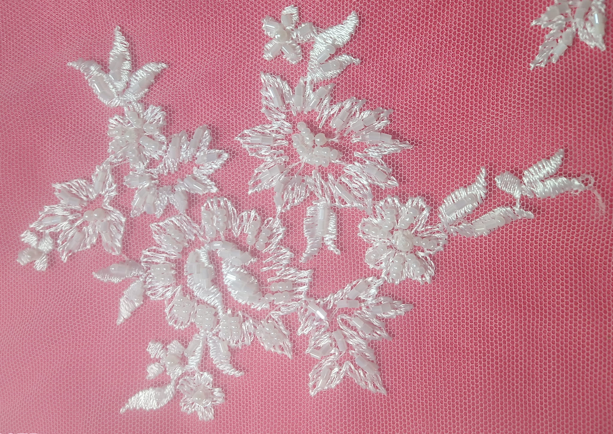Haft na tiulu o szerokości 130 cm. w kolorze kremowym zdobiony koralikami i perełkami