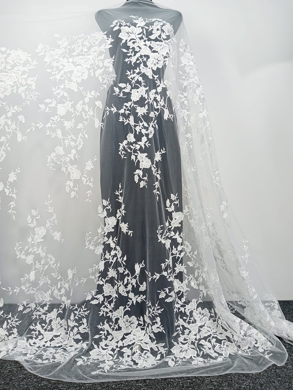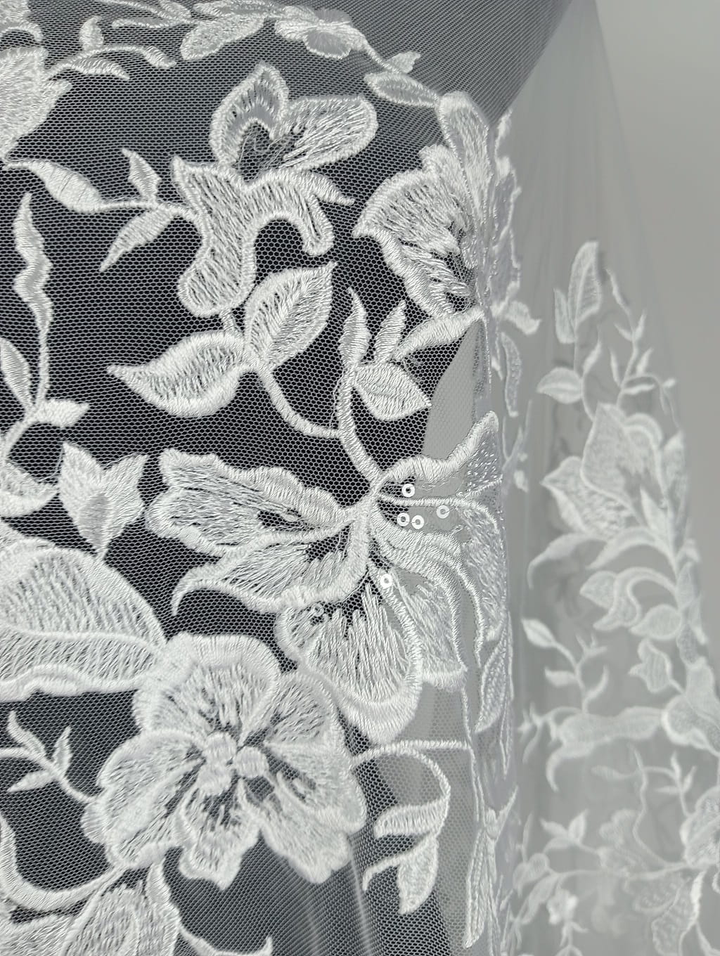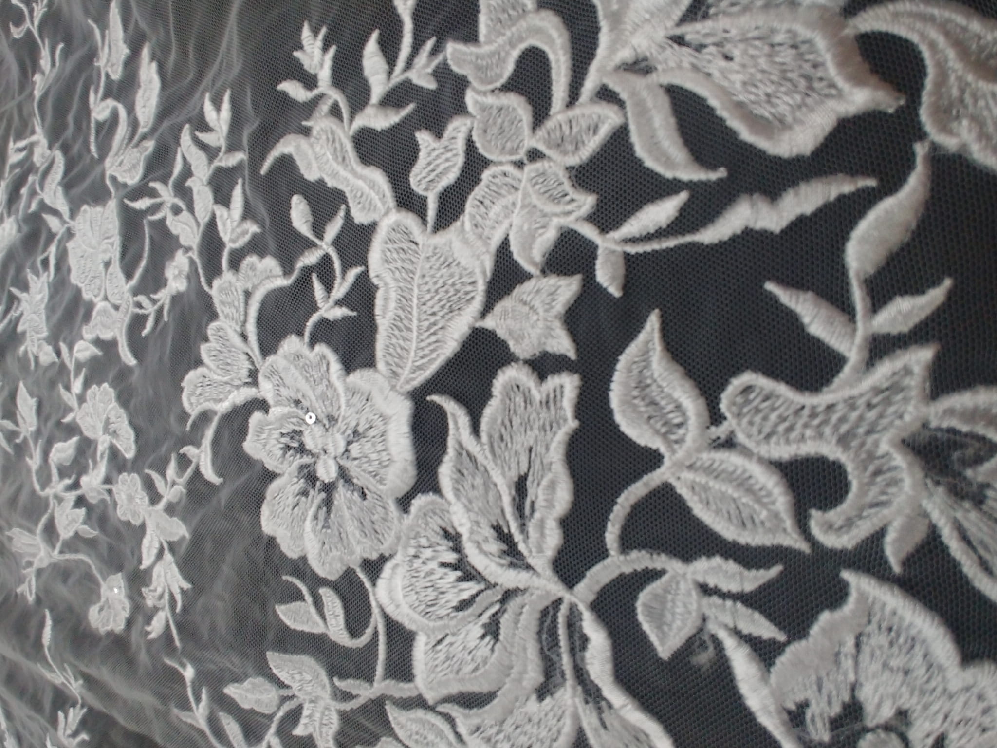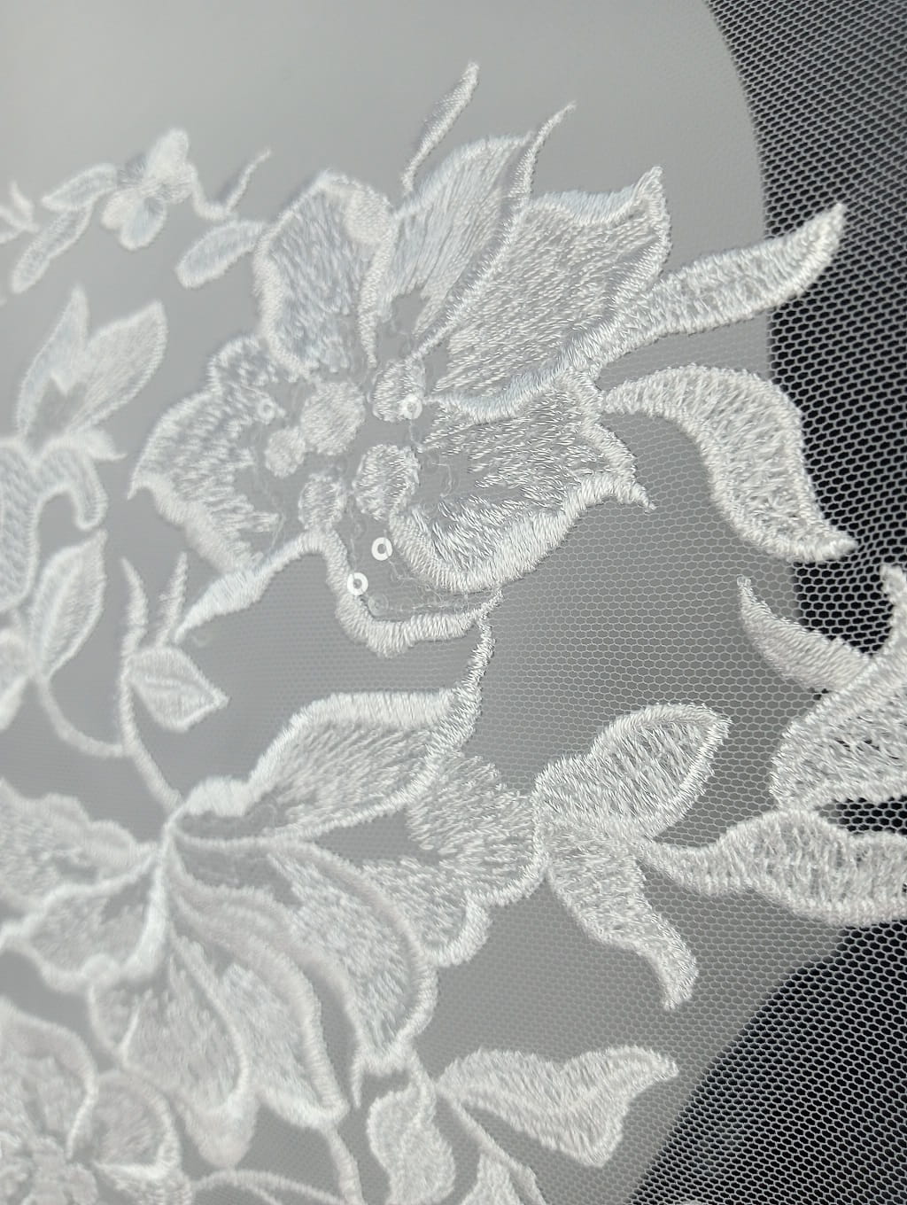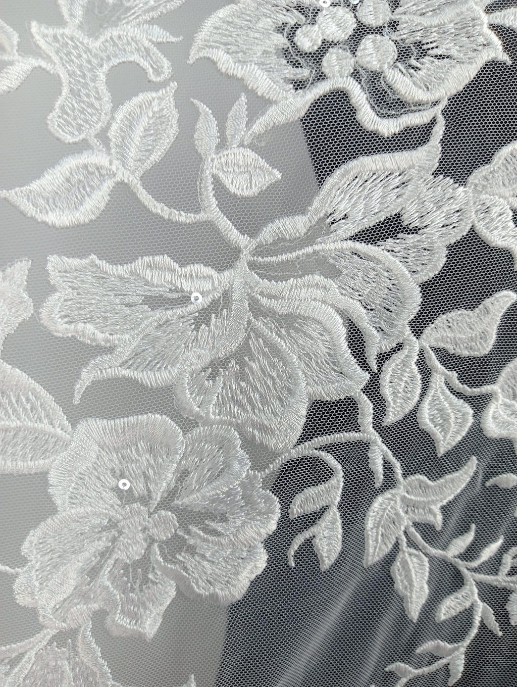 Haft na tiulu zdobiony cekinami składający się z dużych (ok.70 cm wysokości)aplikacji
