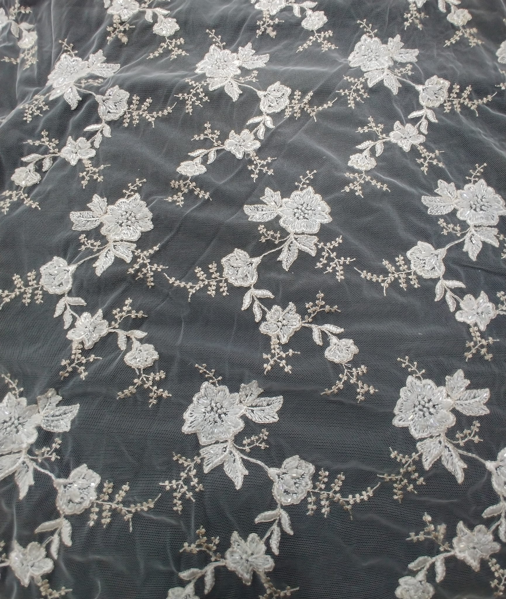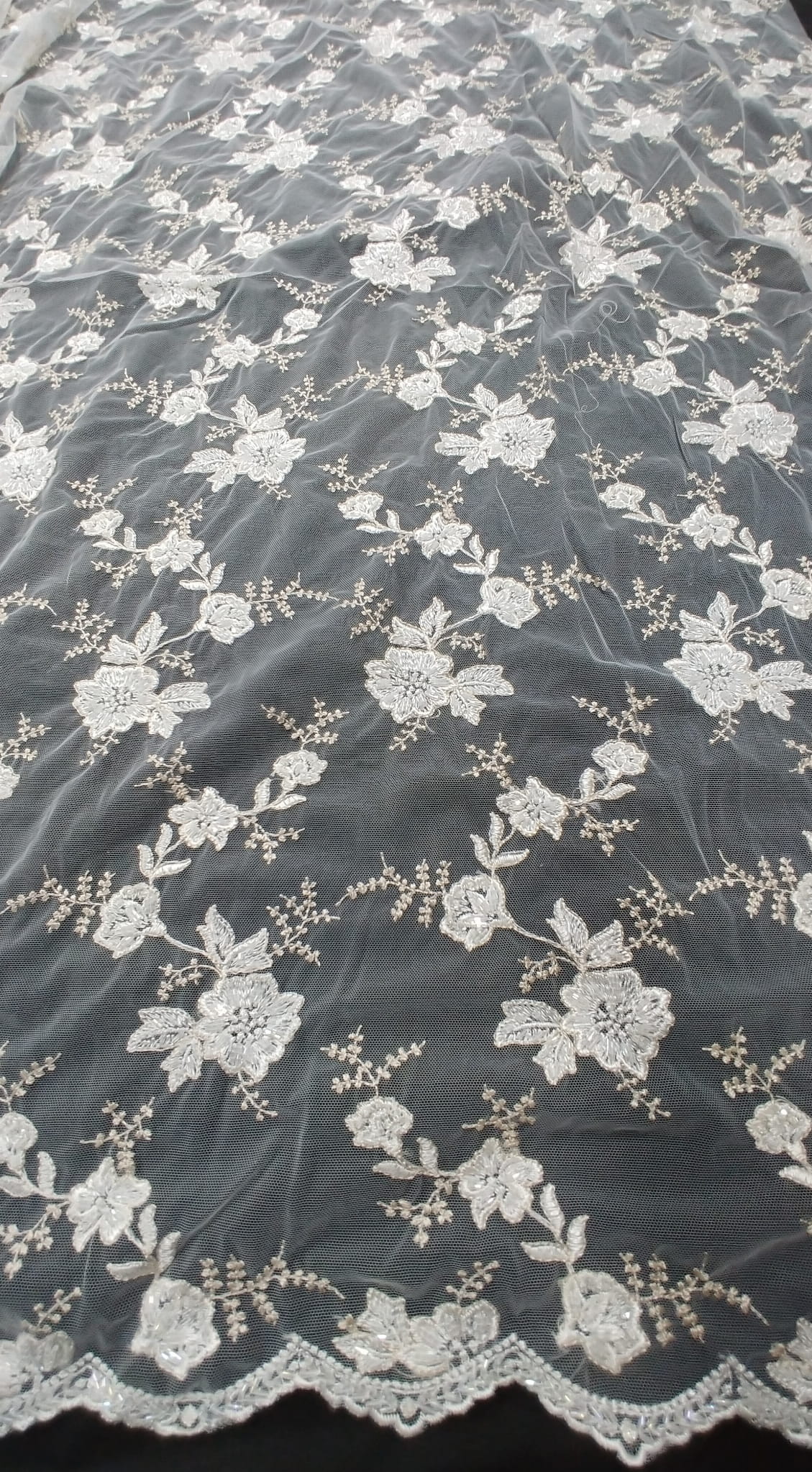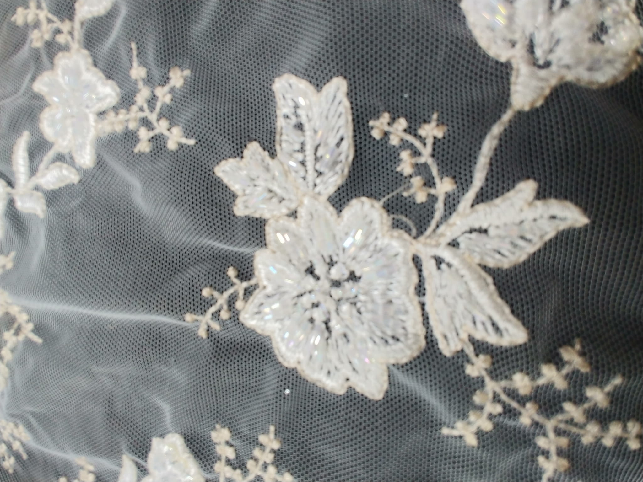 Haft na tiulu o szerokości 130 cm. w kolorze kremowo-beżowym zdobiony perełkami,koralikami i cekinami