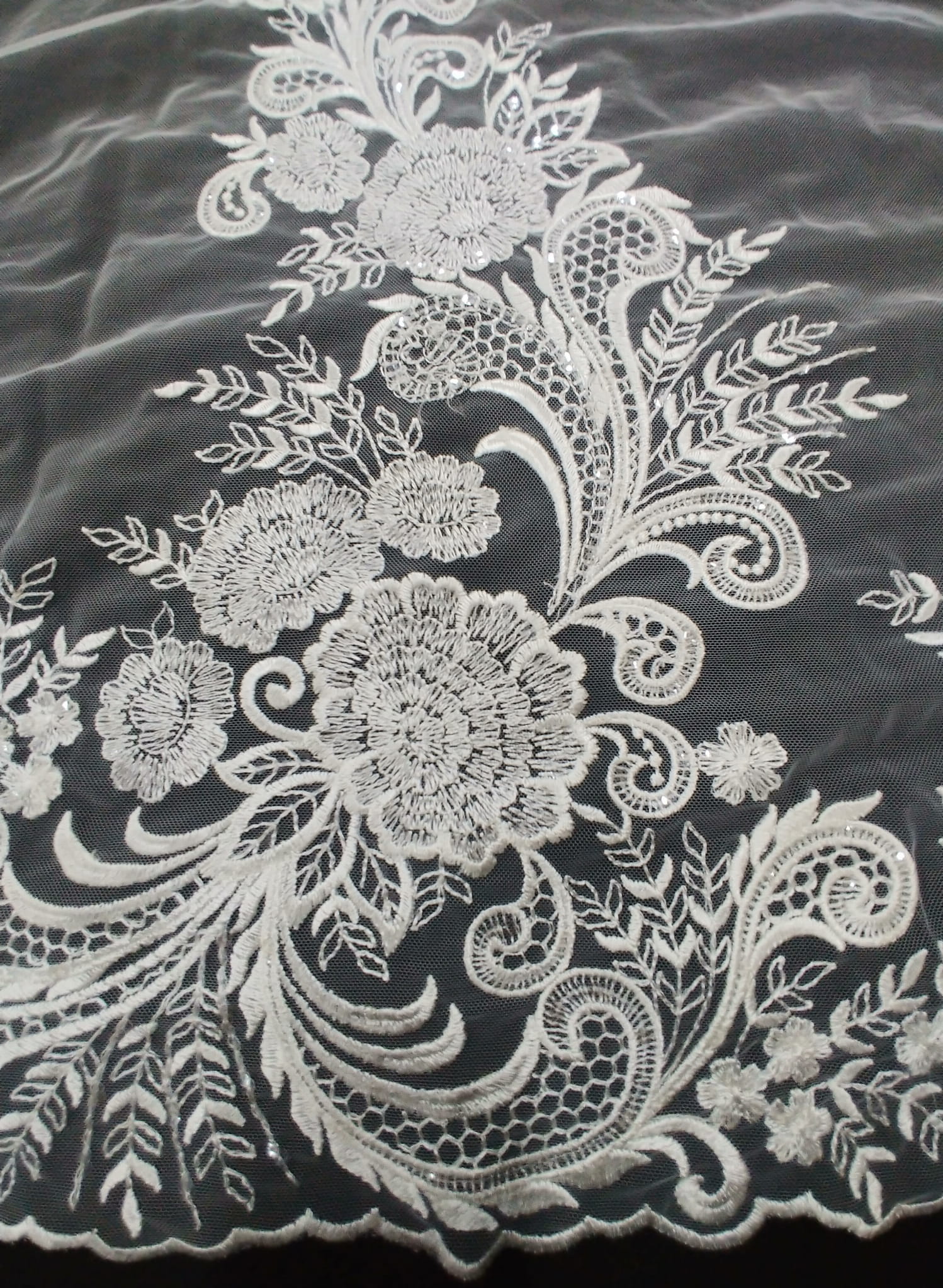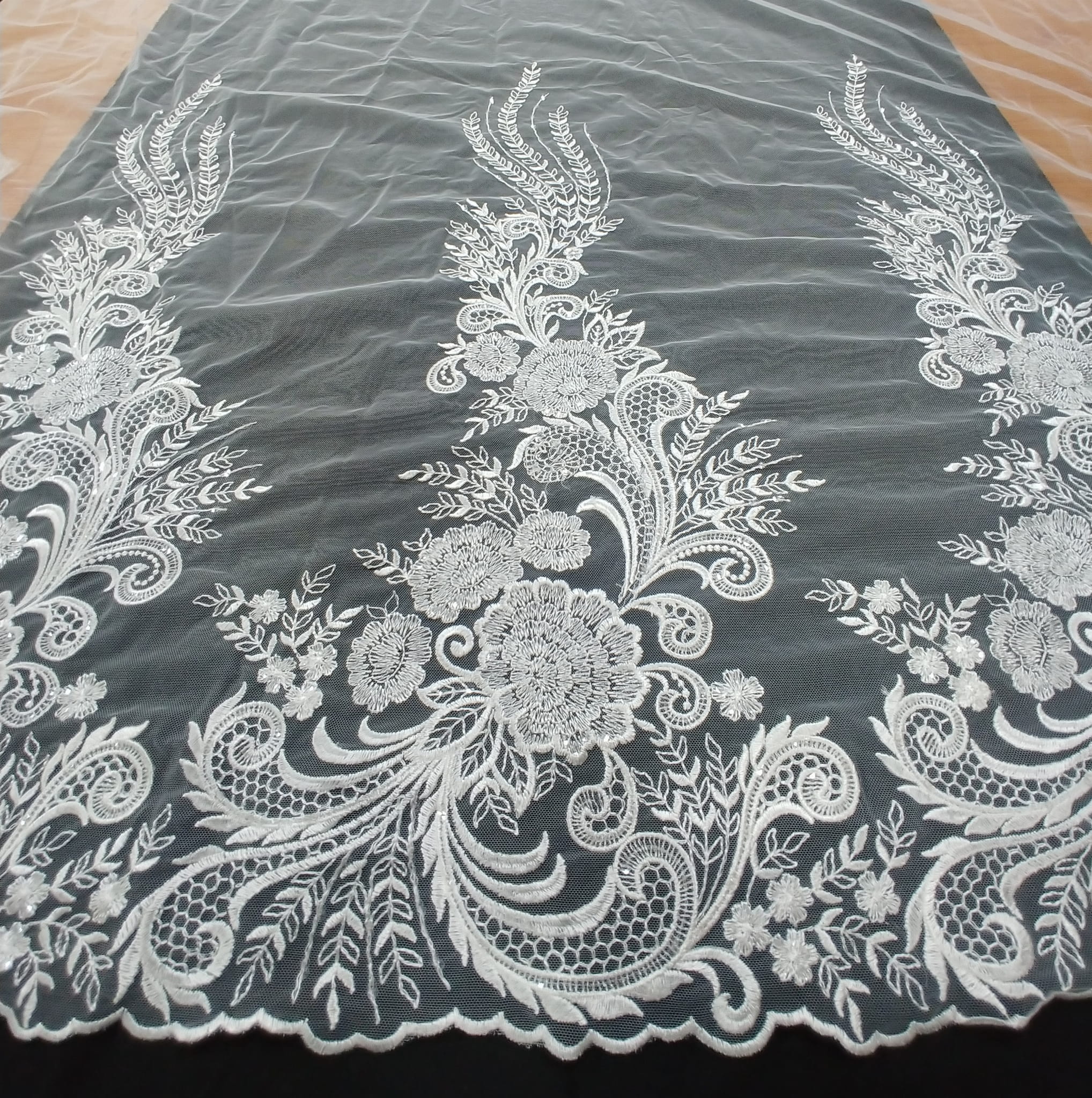 Haft na tiulu w kolorze kremowym składający się z aplikacji zdobionych cekinami o wysokości 70 cm.