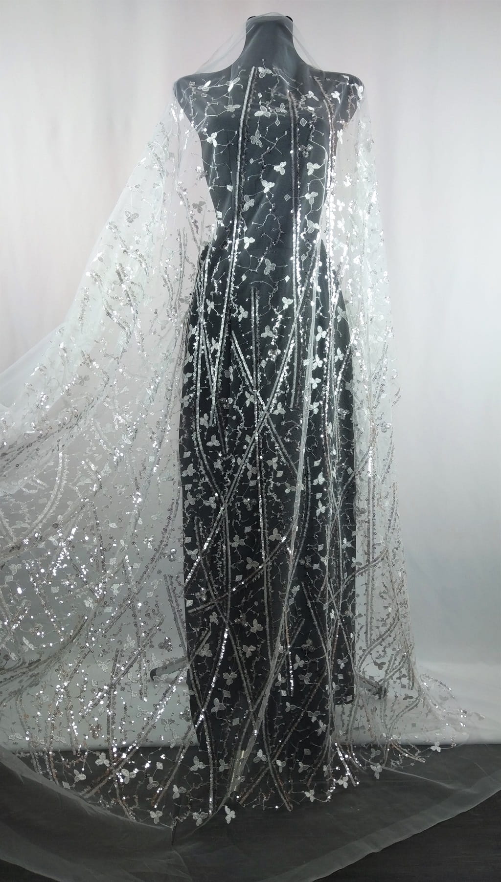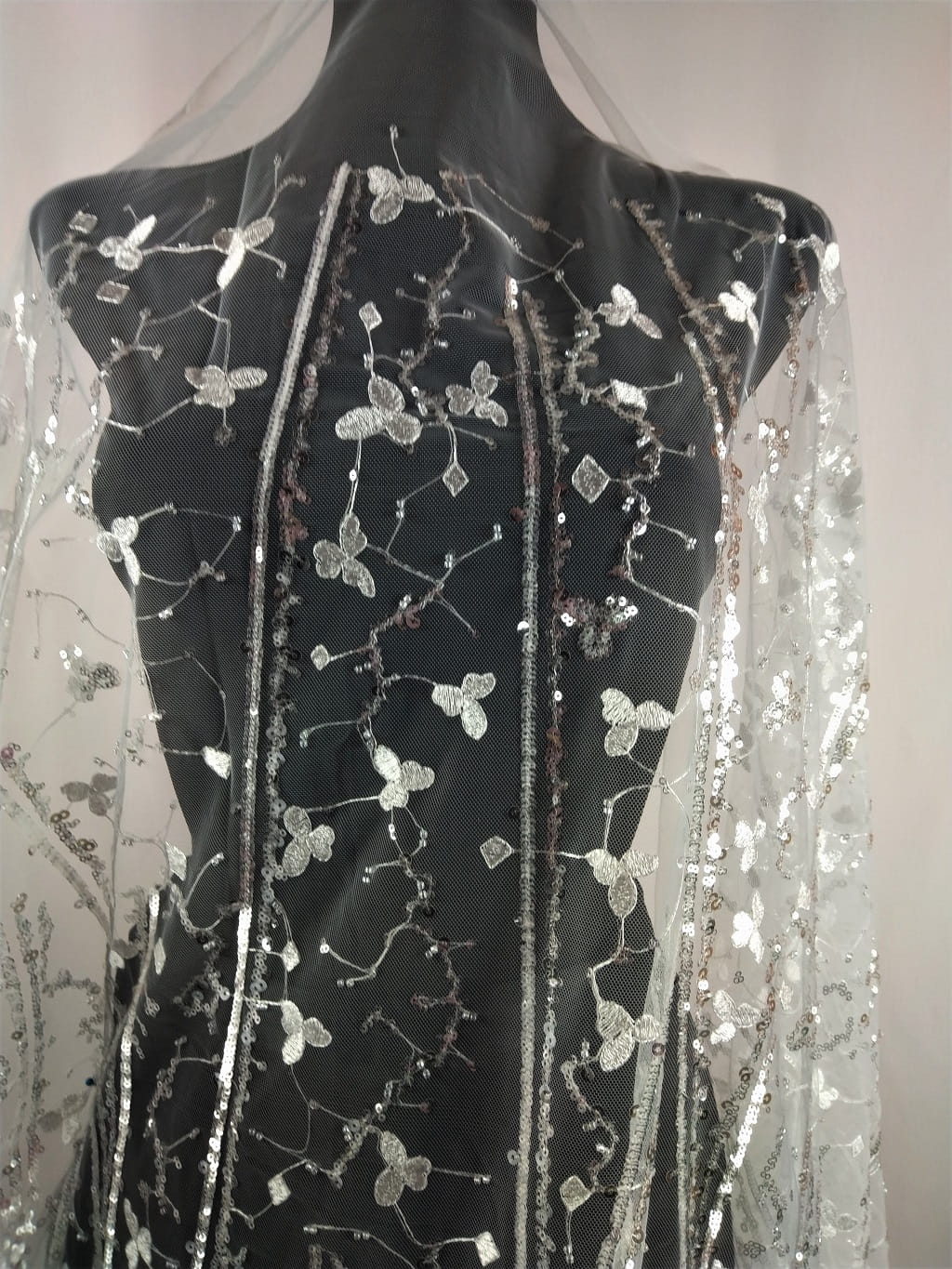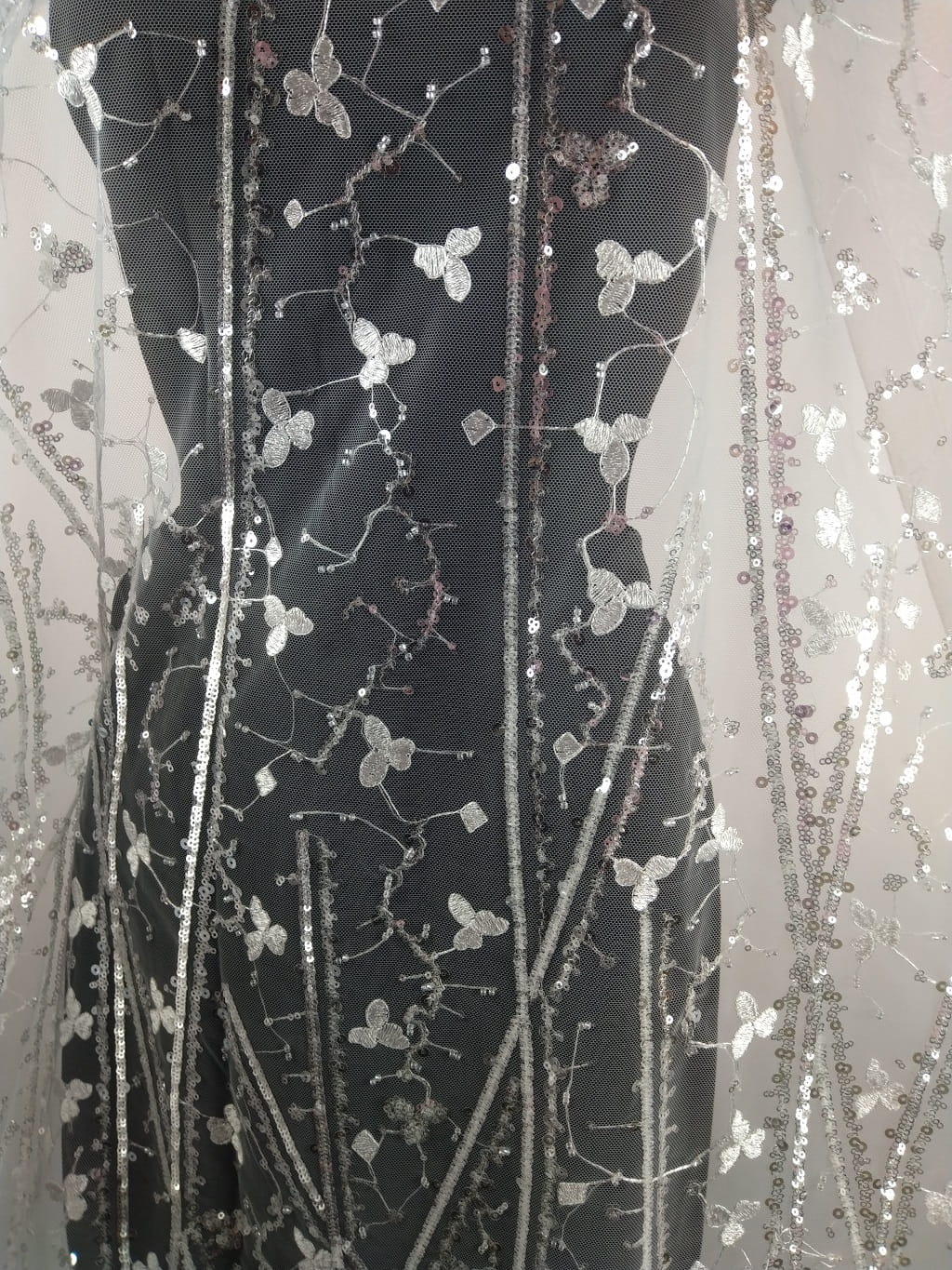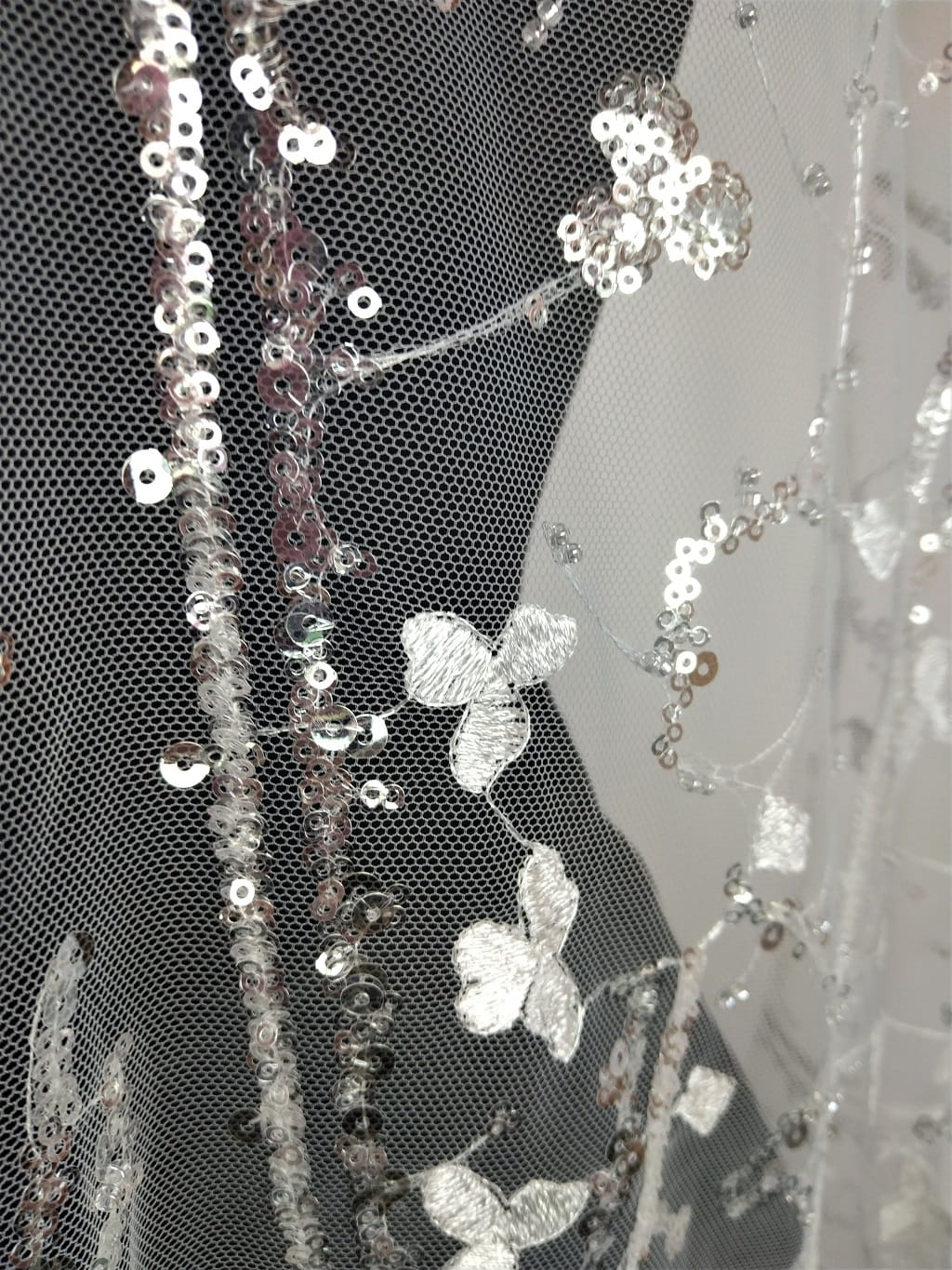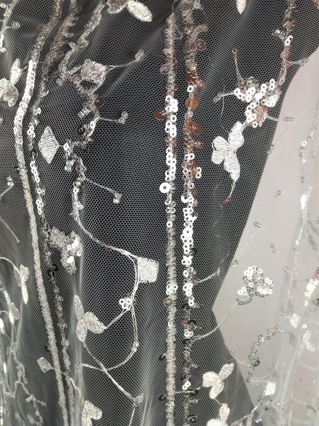 Haft h101 na tiulu; wyszywany srebrnymi odbijającymi światło cekinami, szer.: 1,35 m (jest to szerokość haftu), szer. całego tiulu: 1,6 m