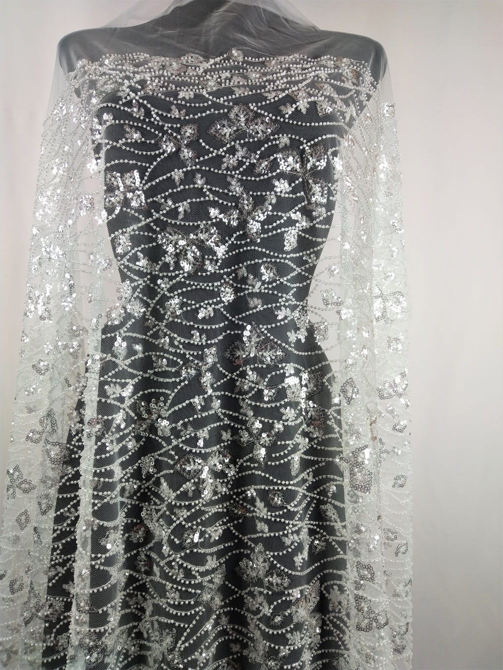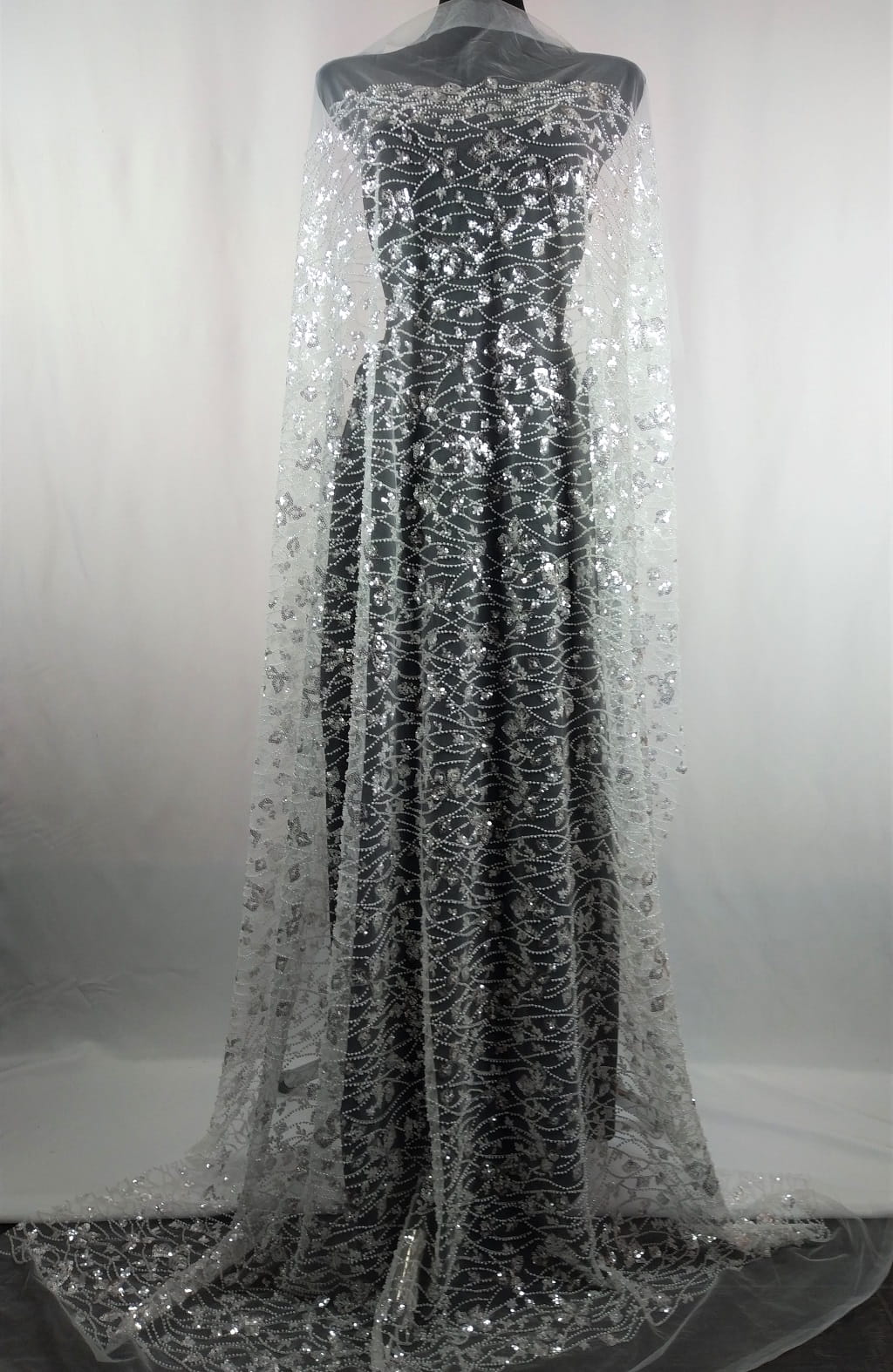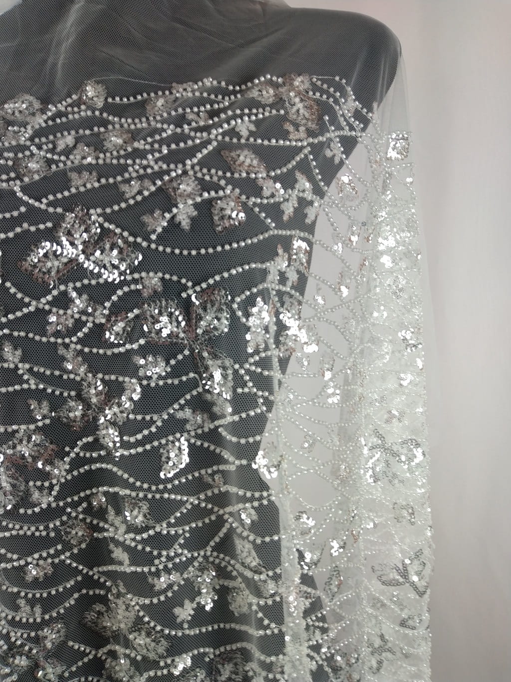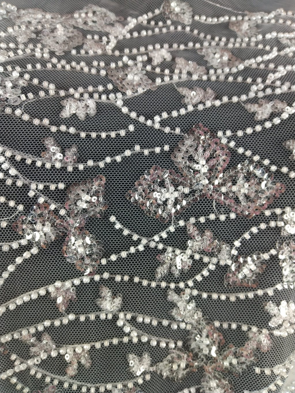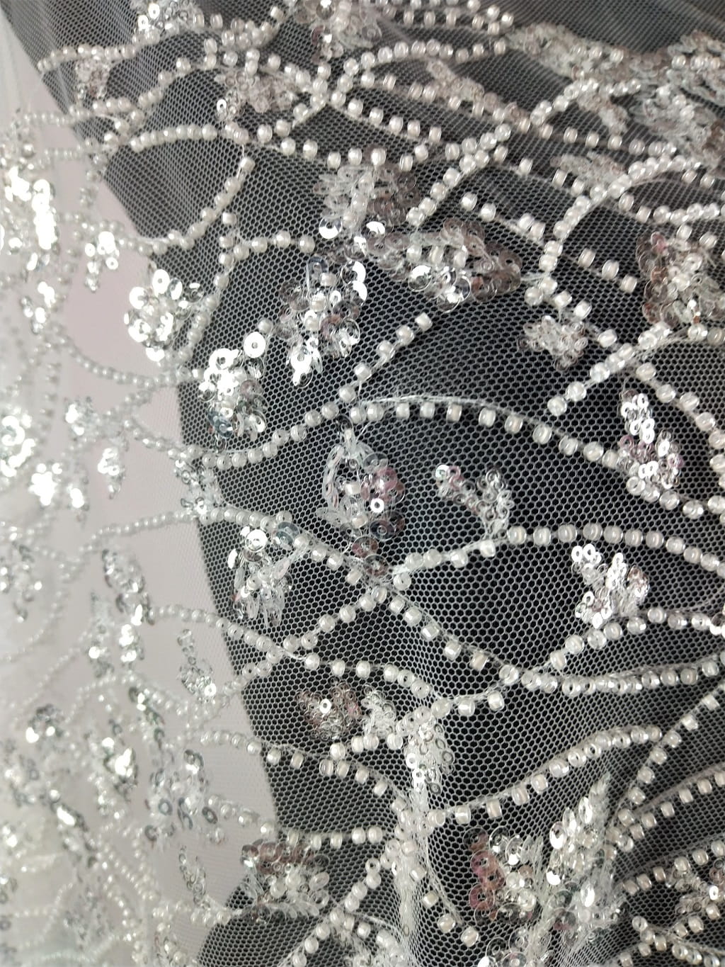 Haft h102 na tiulu; wyszywany przeźroczystymi odbijającymi światło cekinami oraz perłowymi koralikami, szer.: 1,40 m (jest to szerokość haftu), szer. całego tiulu: 1,6 m
