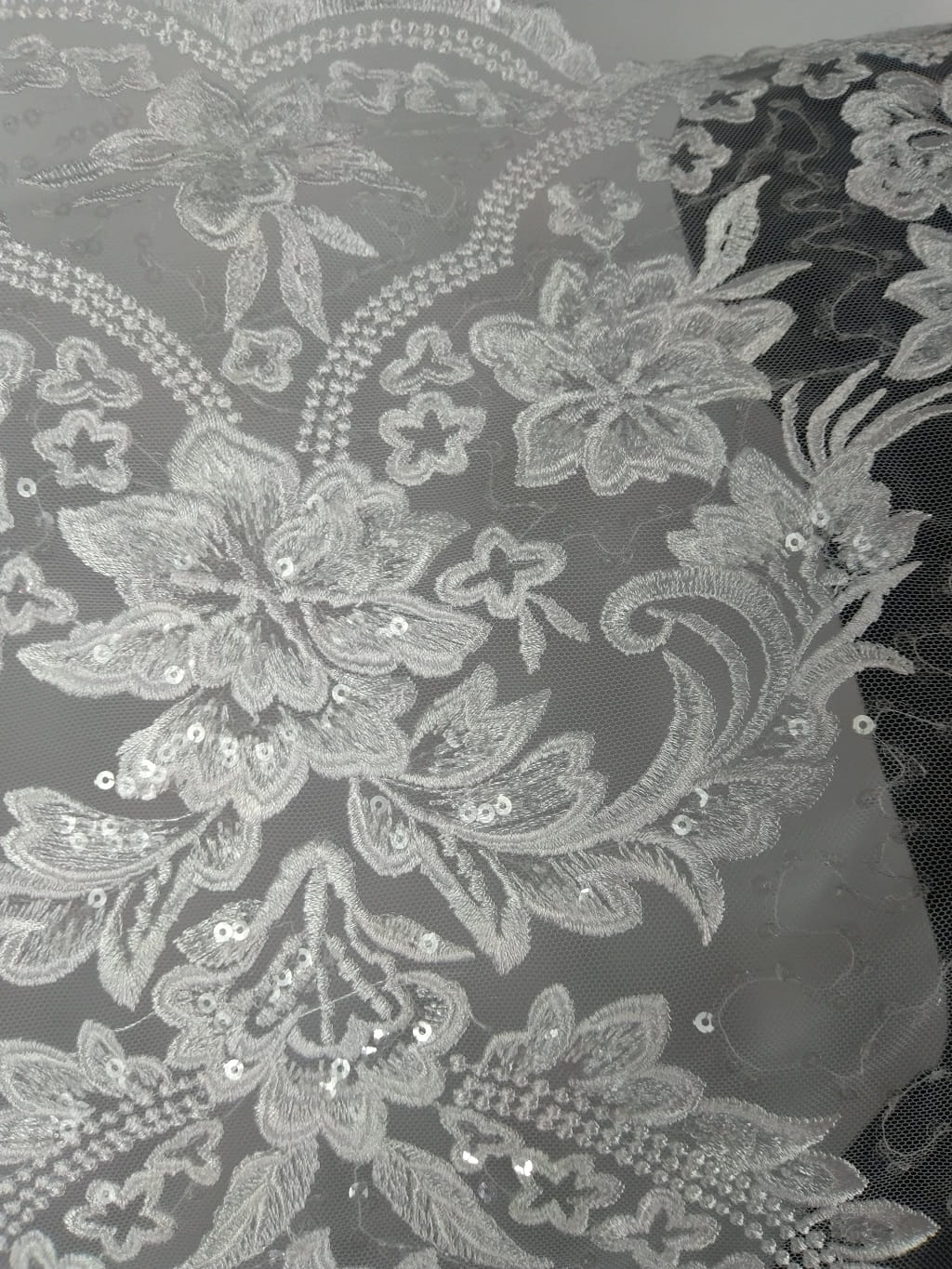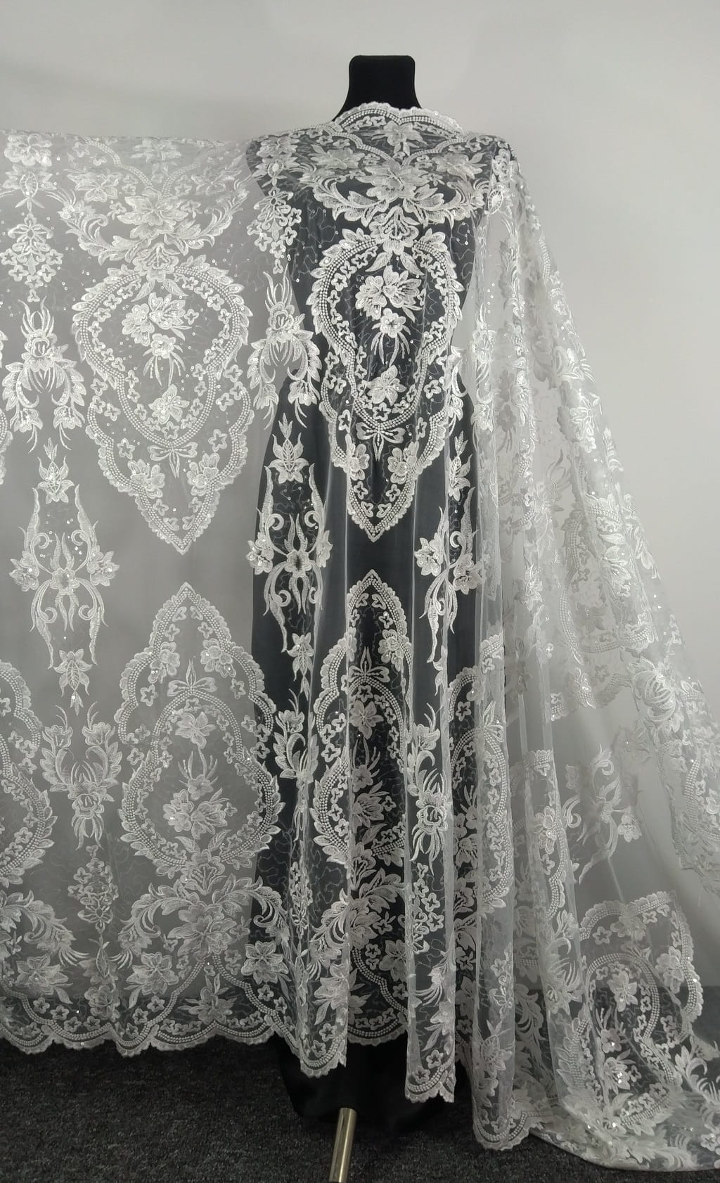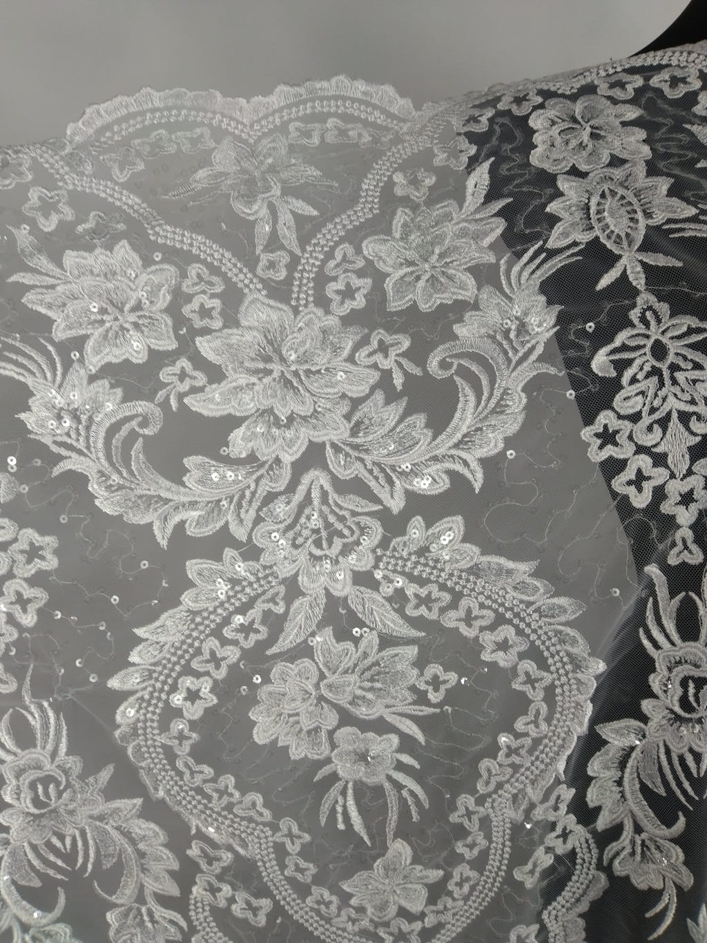 Haft ślubny h104 na tiulu, szer.: 1,3 m, zdobiony przeźroczystymi odbijającymi światło cekinami