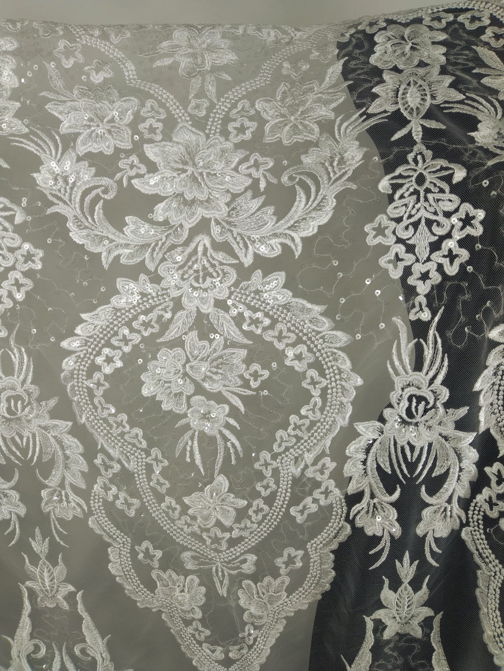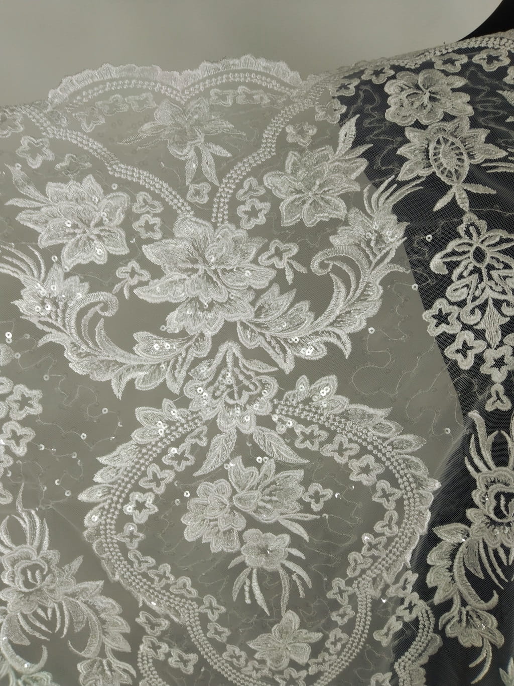 Haft ślubny h104 na tiulu, szer.: 1,3 m, zdobiony przeźroczystymi odbijającymi światło cekinami