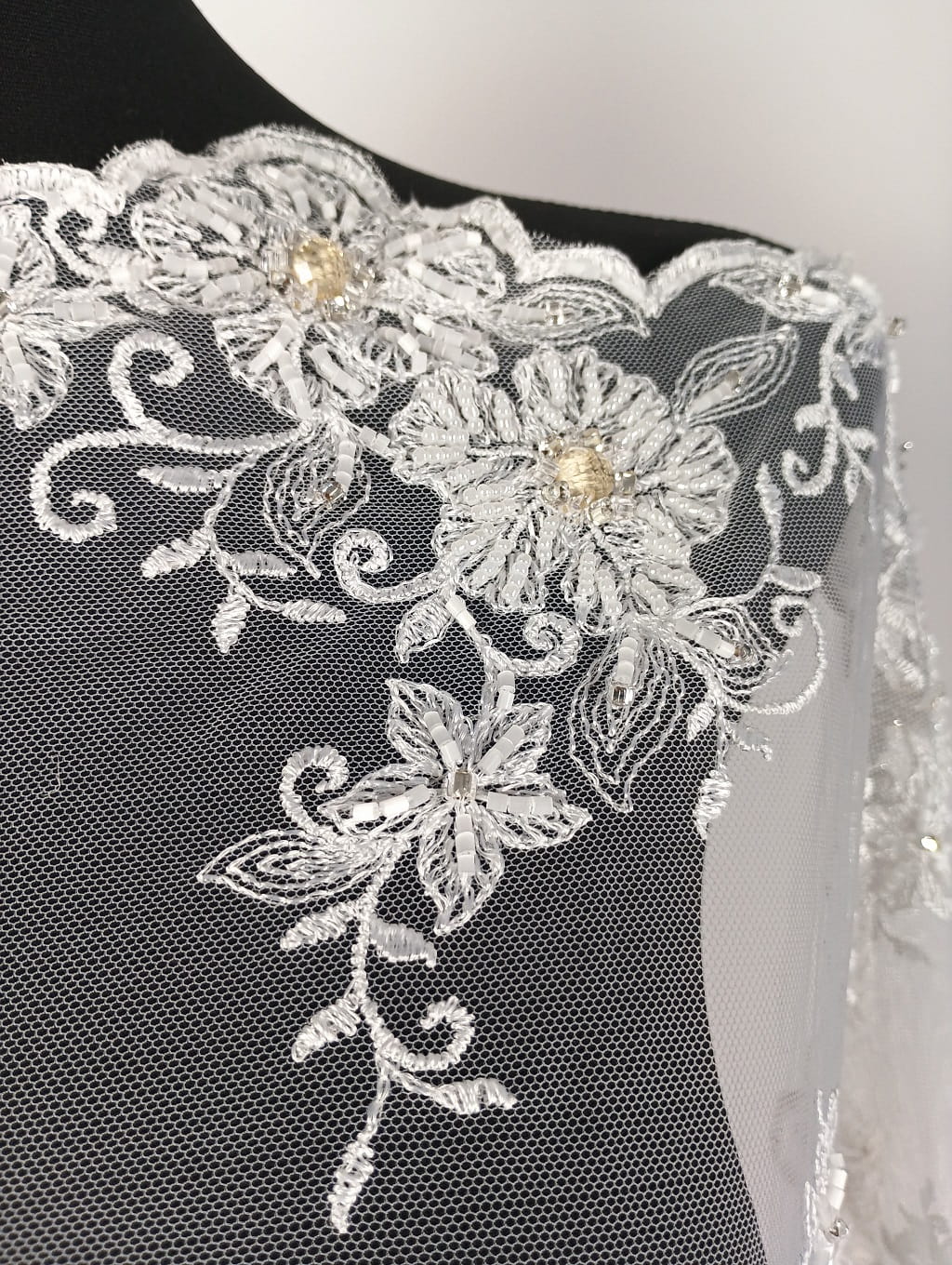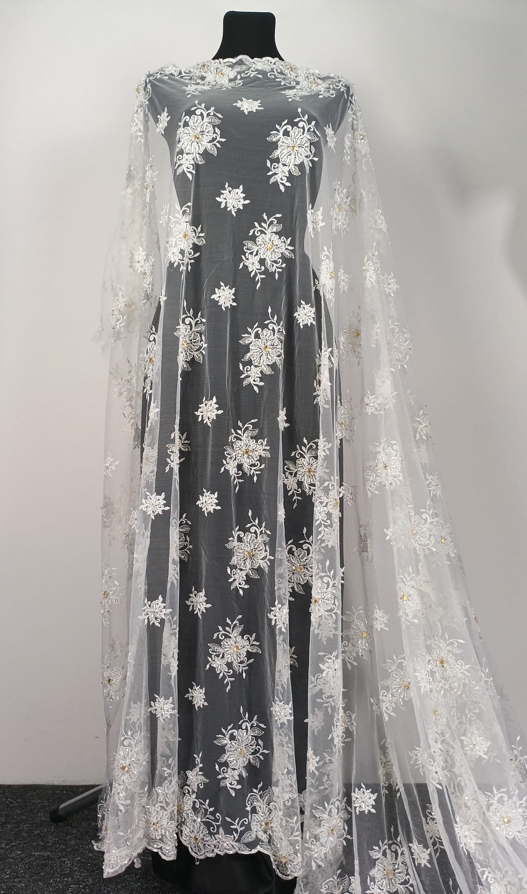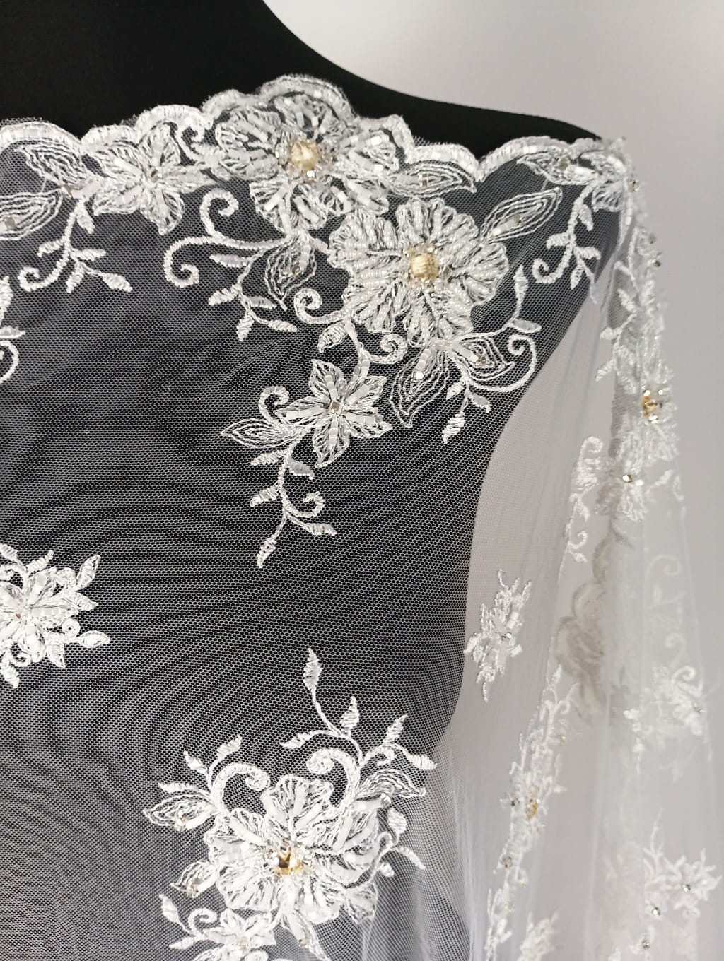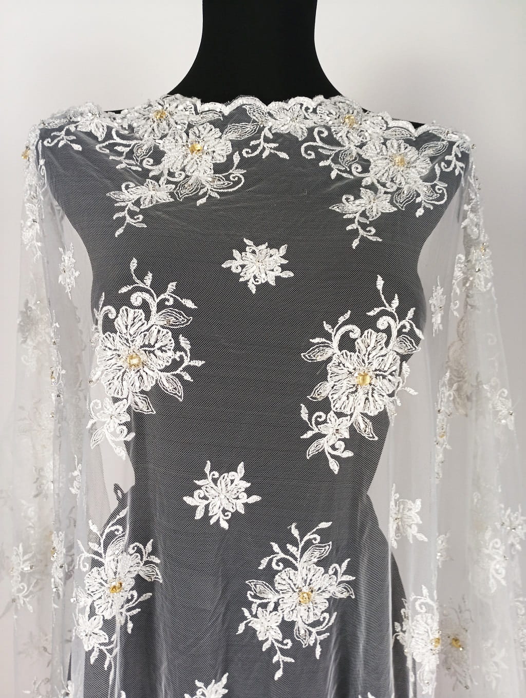 Haft ślubny h118 na tiulu, szer.: 1,30 m, zdobiony perełkami, koralikami i żółtymi kryształkami a'la diament.