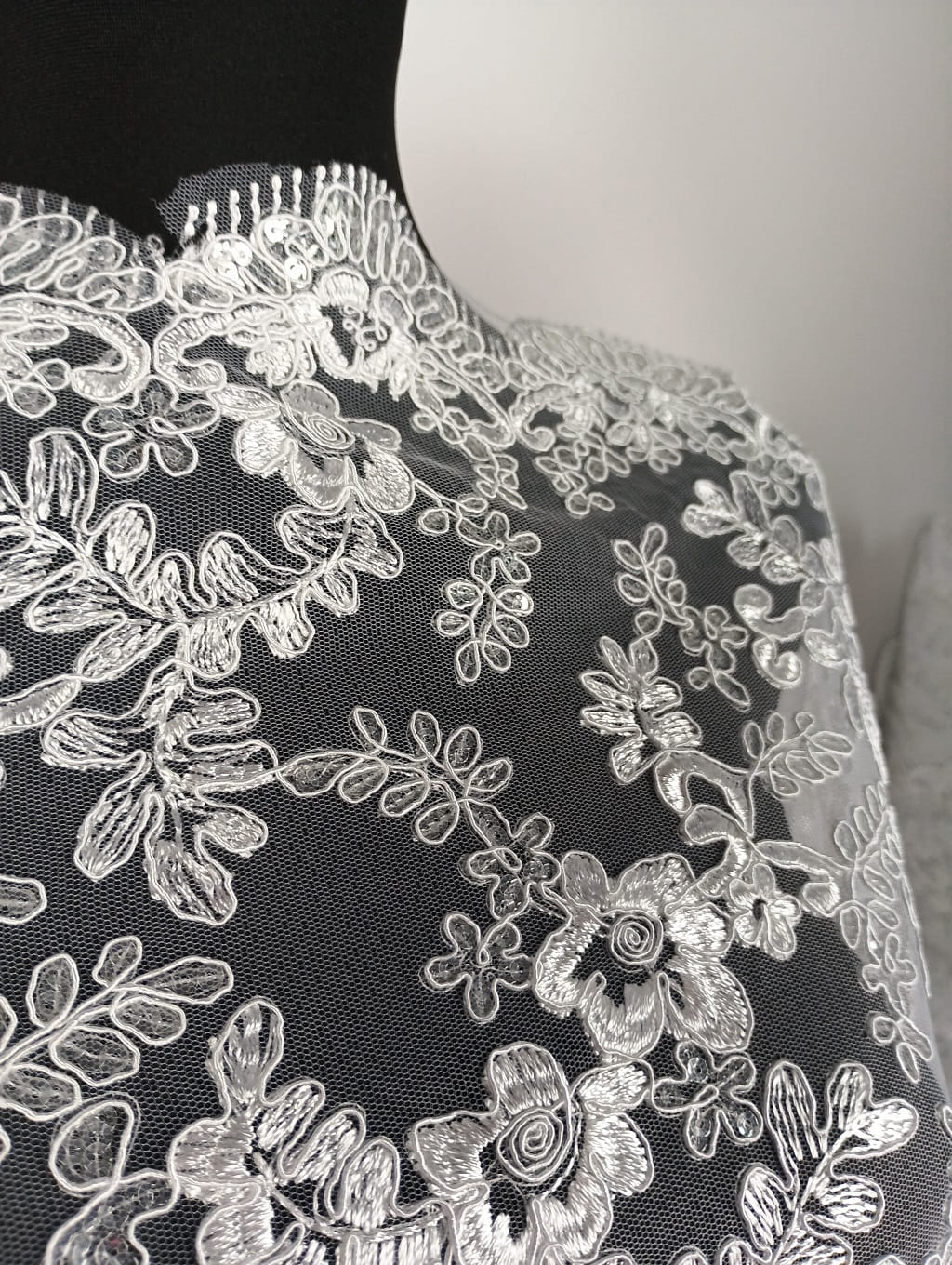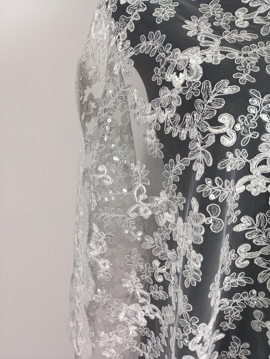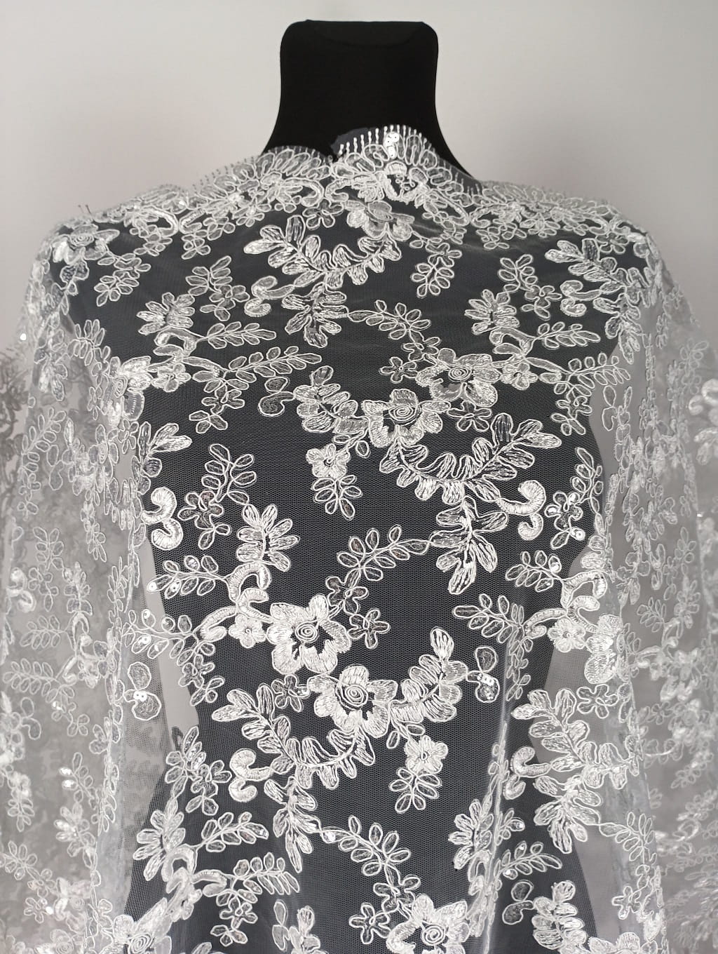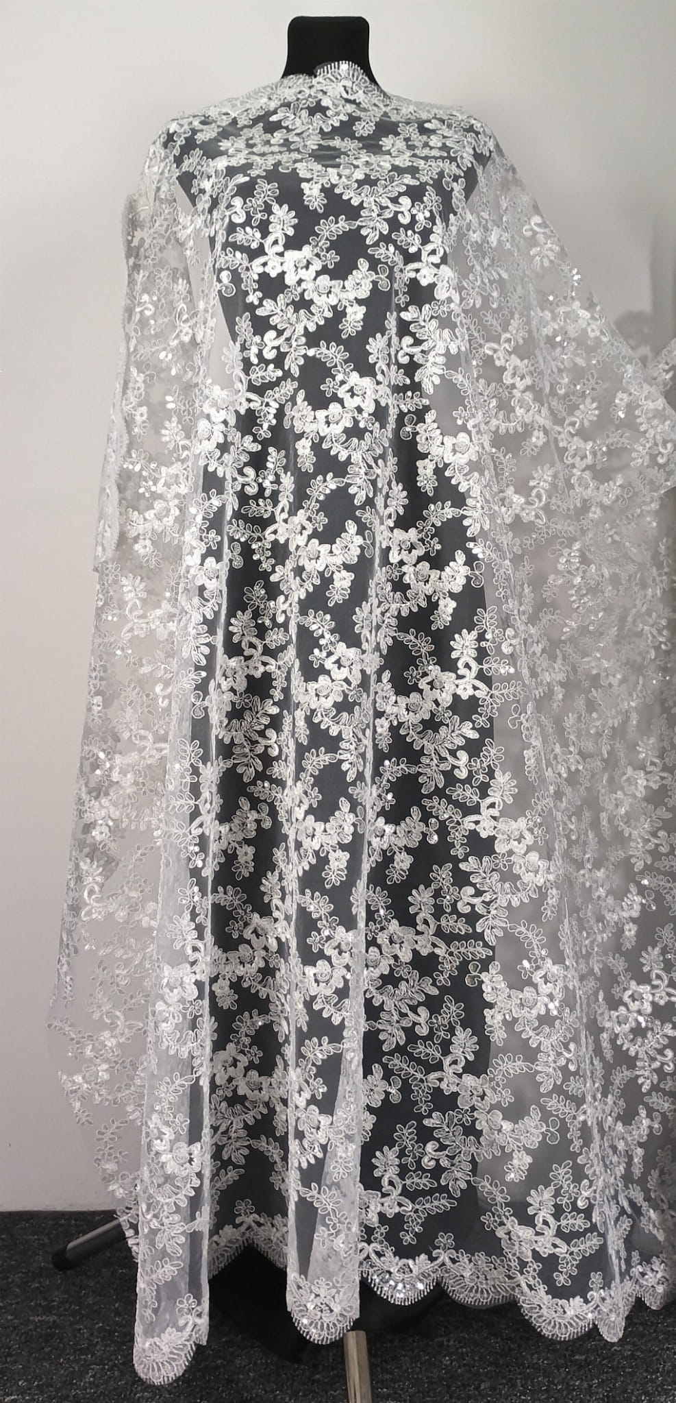 Haft ślubny lub komunijny h119 na tiulu, szer.: 1,30 m, zdobiony odbijającymi światło przeźroczystymi cekinami.