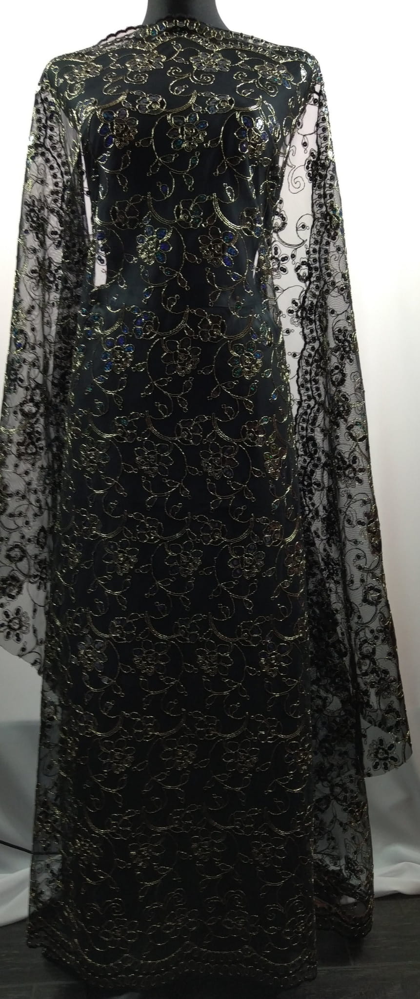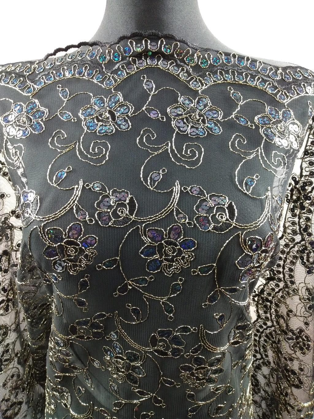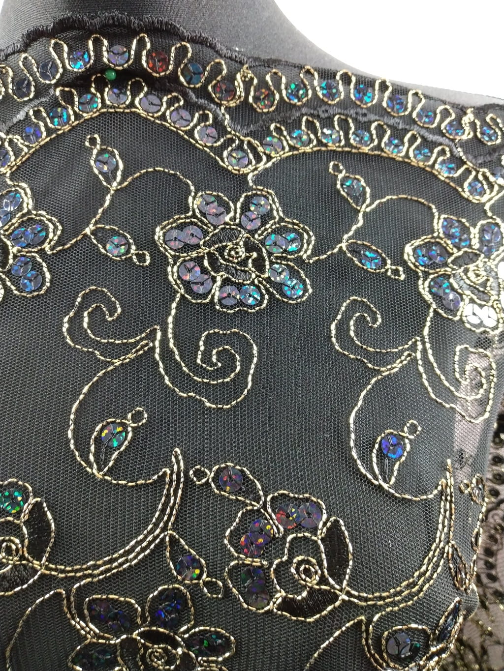 Haft h90 na czarnym tiulu, wyszywany złotą nitką i zdobiony cekinami mieniącymi się kolorami od niebieskiego poprzez szafirowy, granatowy, zielonkawy, fioletowy...