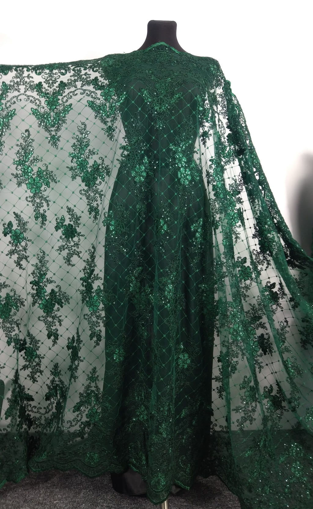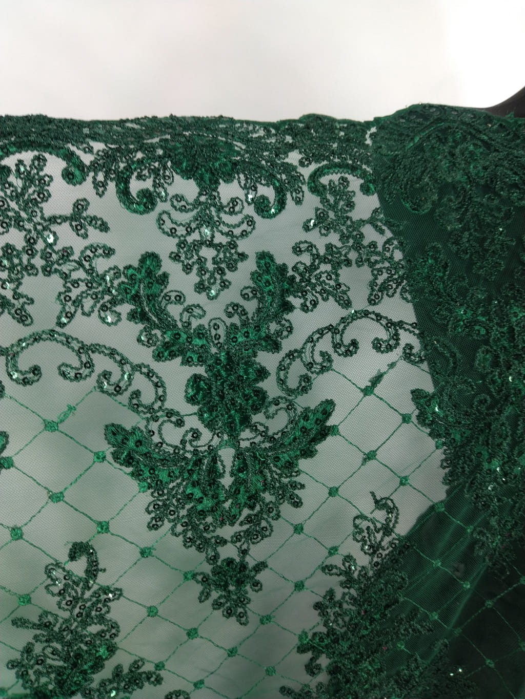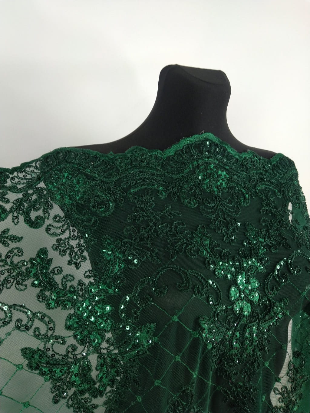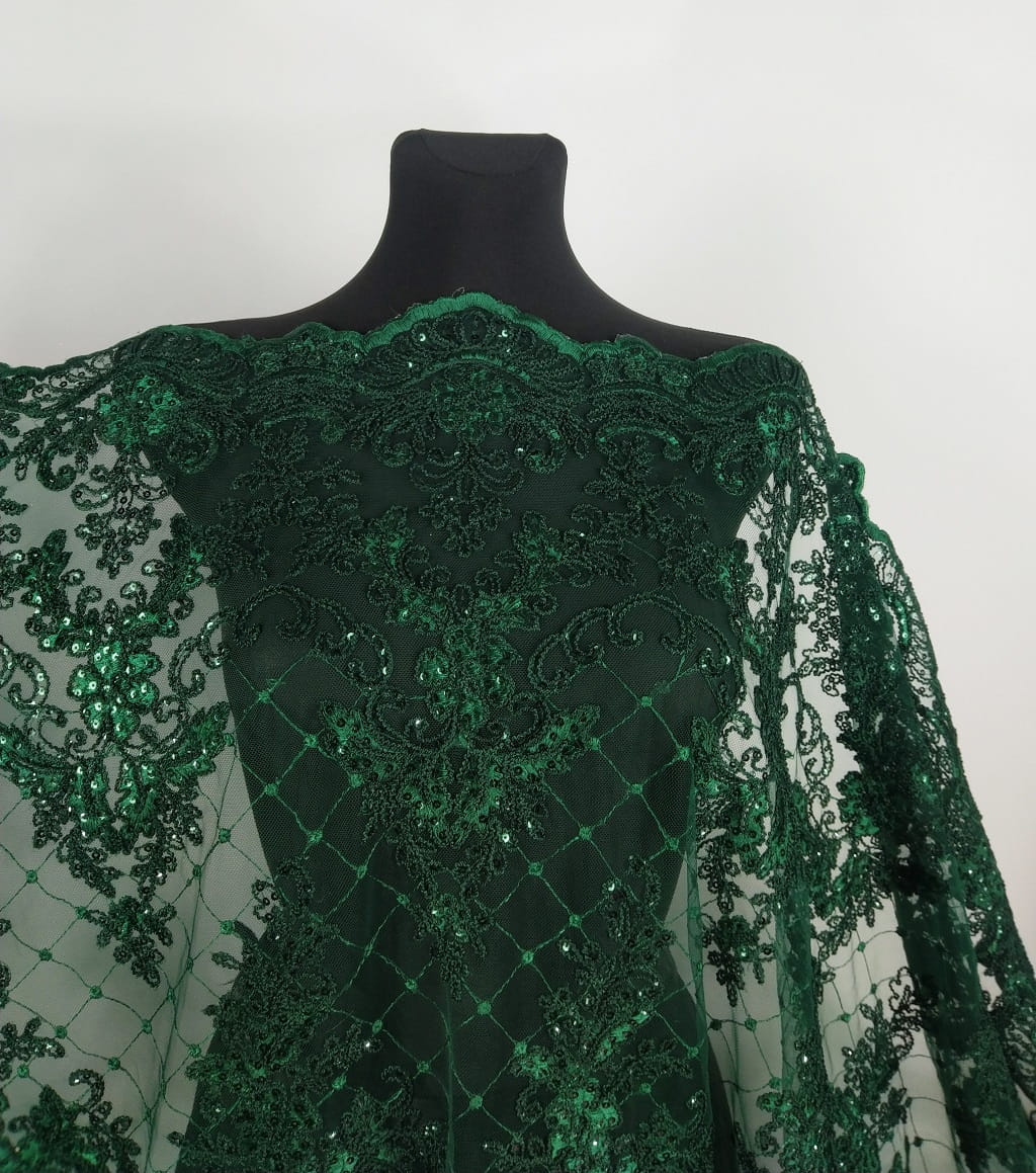 Haft h96 - na tiulu zdobiony ciemnozielonymi odbijającymi światło cekinami