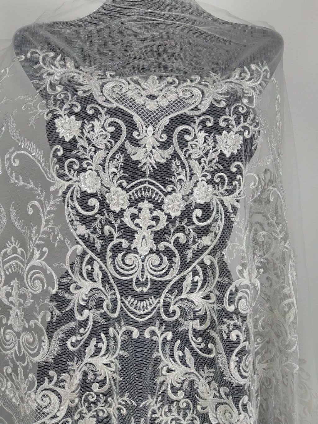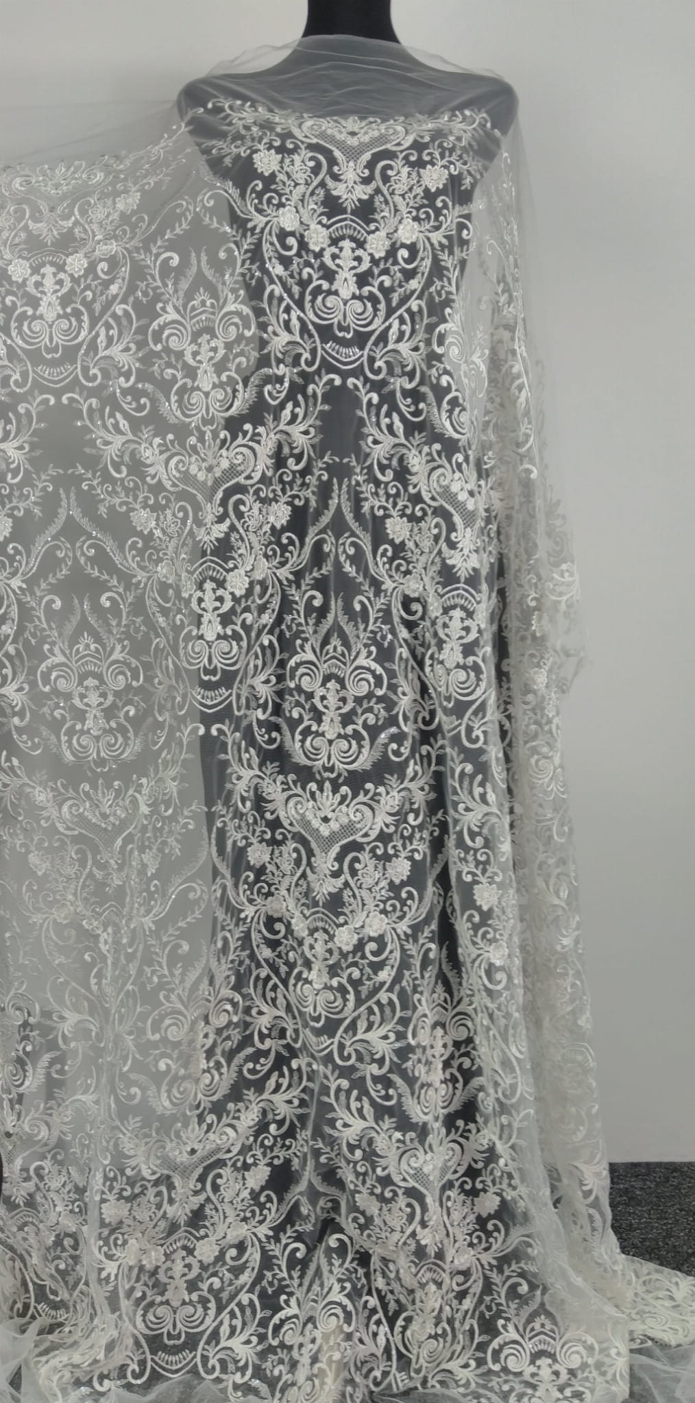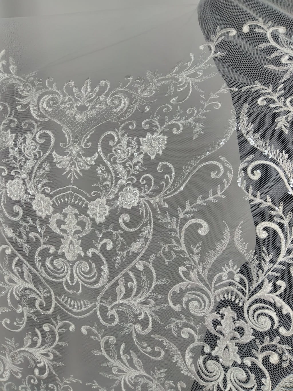 Haft na tiulu (h103) zdobiony przeźroczystymi odbijającymi światło cekinami;