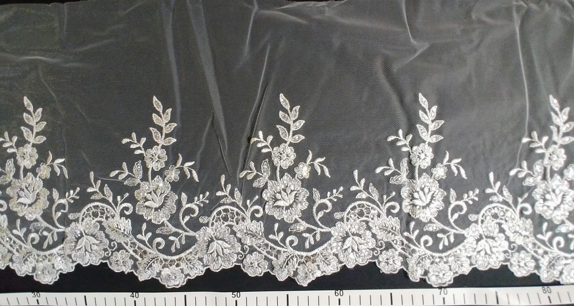 Haft (taśma) h97, na tiulu zdobiony srebrnymi odbijającymi światło cekinami;