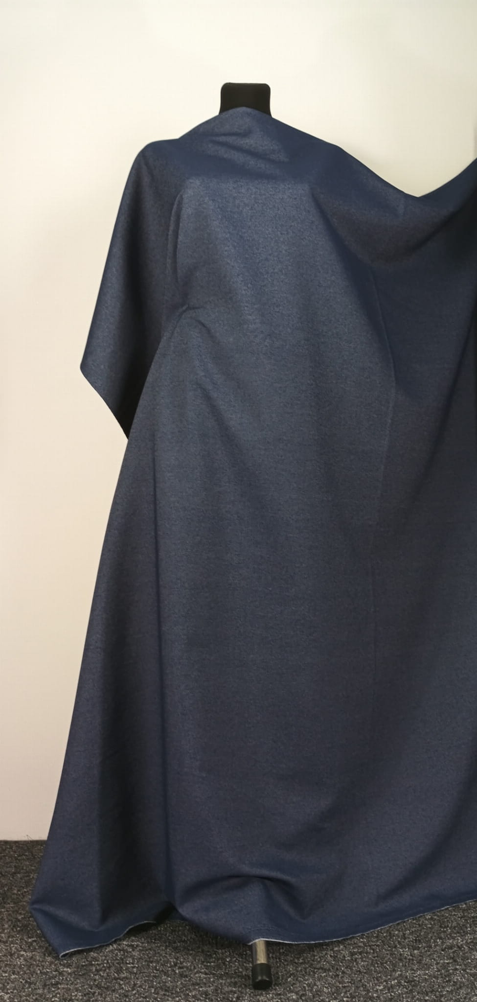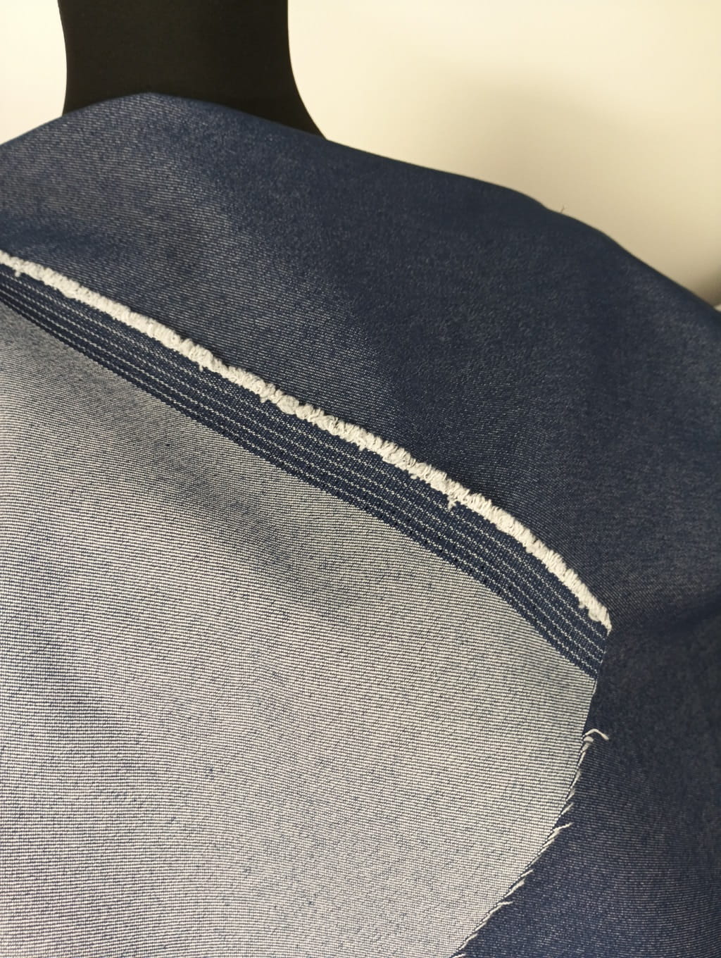 Klasyczny granatowy denim (jeans) bawełniany (skręcone grubsze bawełniane włókna w osnowie) + rozciągliwa cienka biała przędza (w wątku), która zapewnia tkaninie lekką elastyczność. Materiał średniej grubości (200g/m2), dość miękki, idealny na sukienki, spódnice czy lżejsze spodnie. Sprawdzi się również jako tkanina na zasłony, dekoracyjne poszewki, itp.
