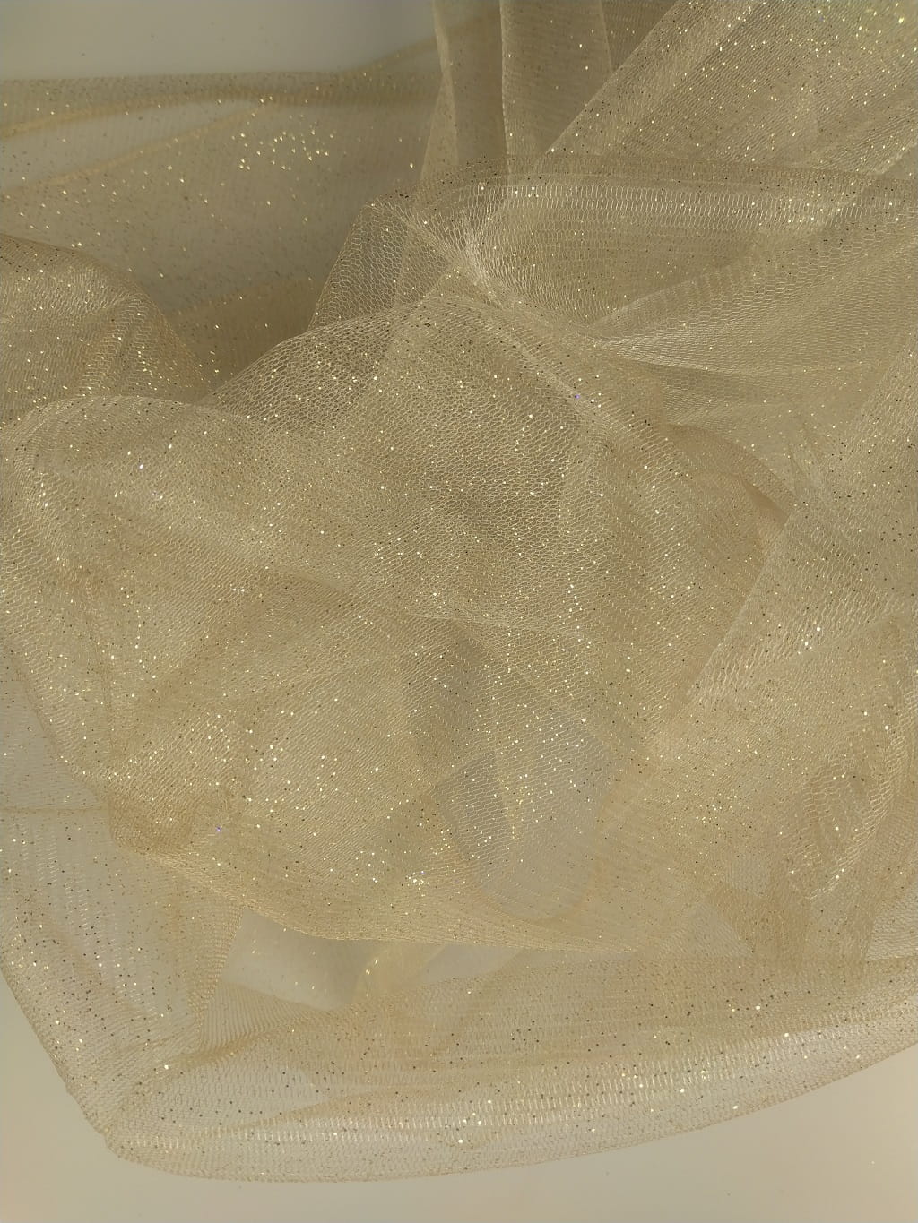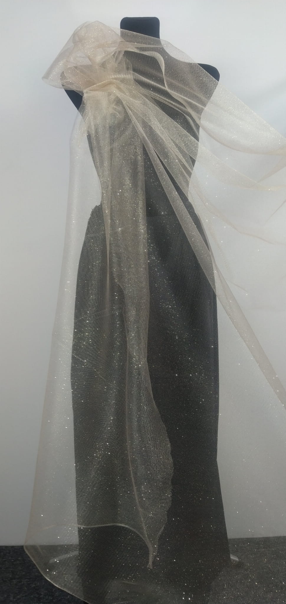 Tiul zwiewny o sporych podłużnych oczkach, ładnie się układa. Z brokatem, który pięknie odbija światło.