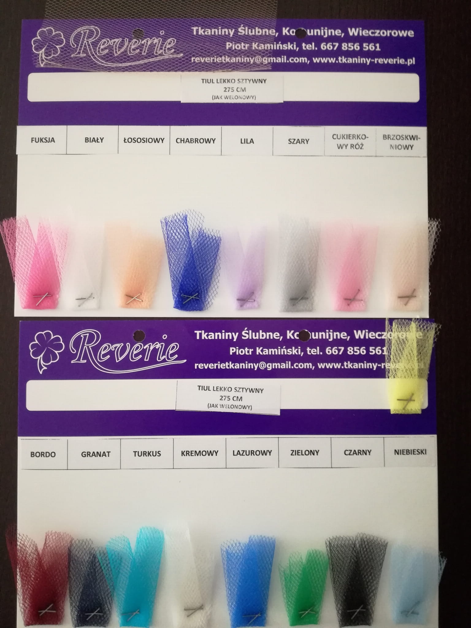 Tiul lekko sztywny, sztywnością zbliżony do welonowego o szerokości - 2,75 m. Oczka trochę większe niż w tiulu welonowym. Idealny na sukienki, spódniczki, dekoracje, ozdoby florystyczne...